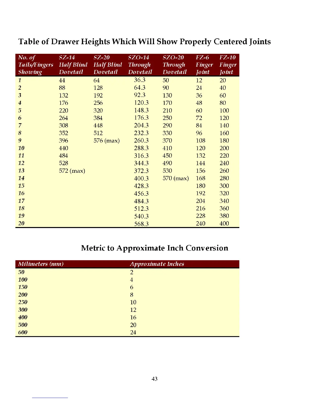 Festool VS-600 - Reference Tables for Drawer Construction; Drawer Heights for Properly Centered Joints