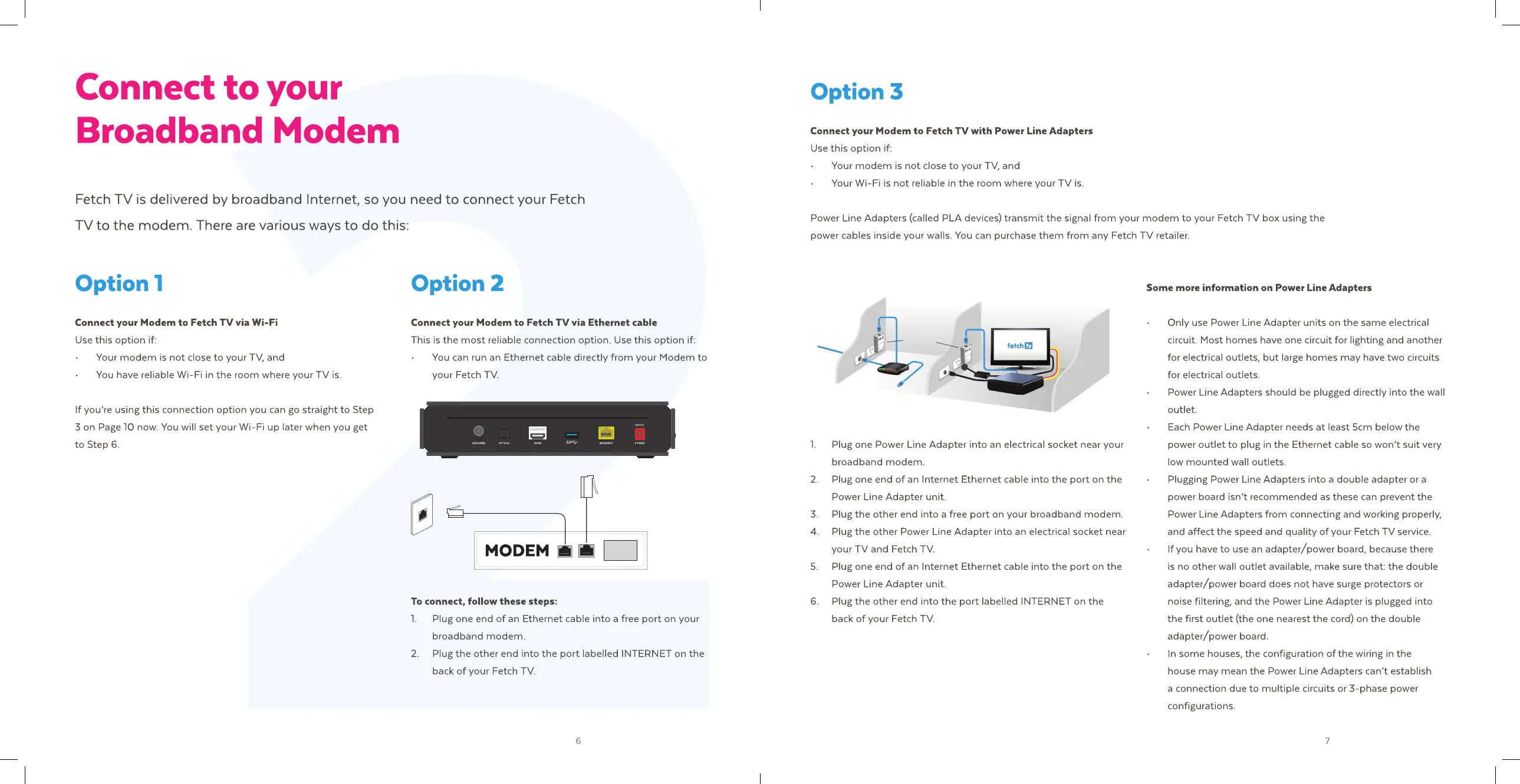Fetch TV MIGHTY - Connect to your Broadband Modem; Option 1 Connect your Modem to Fetch TV via Wi-Fi; Option 2 Connect your Modem to Fetch TV via Ethernet cable; Option 3 Connect your Modem to Fetch TV with Power Line Adapters