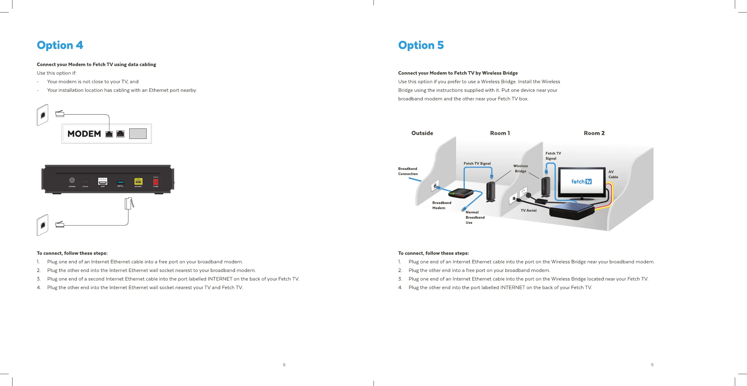 Fetch TV MIGHTY - Option 4 Connect your Modem to Fetch TV using data cabling; Option 5 Connect your Modem to Fetch TV by Wireless Bridge