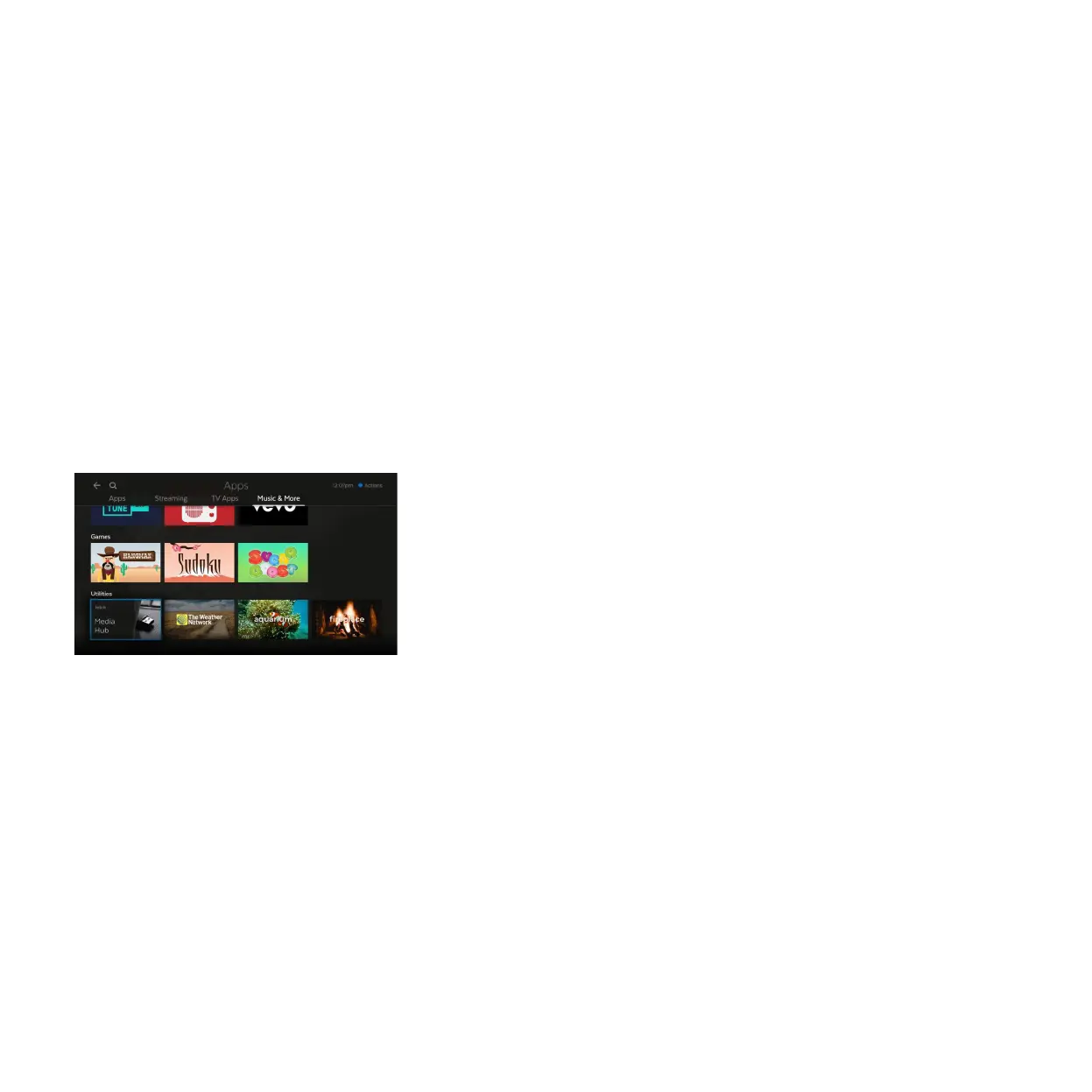 You can access music apps, games, and utilities like My Media Hub and screensavers.