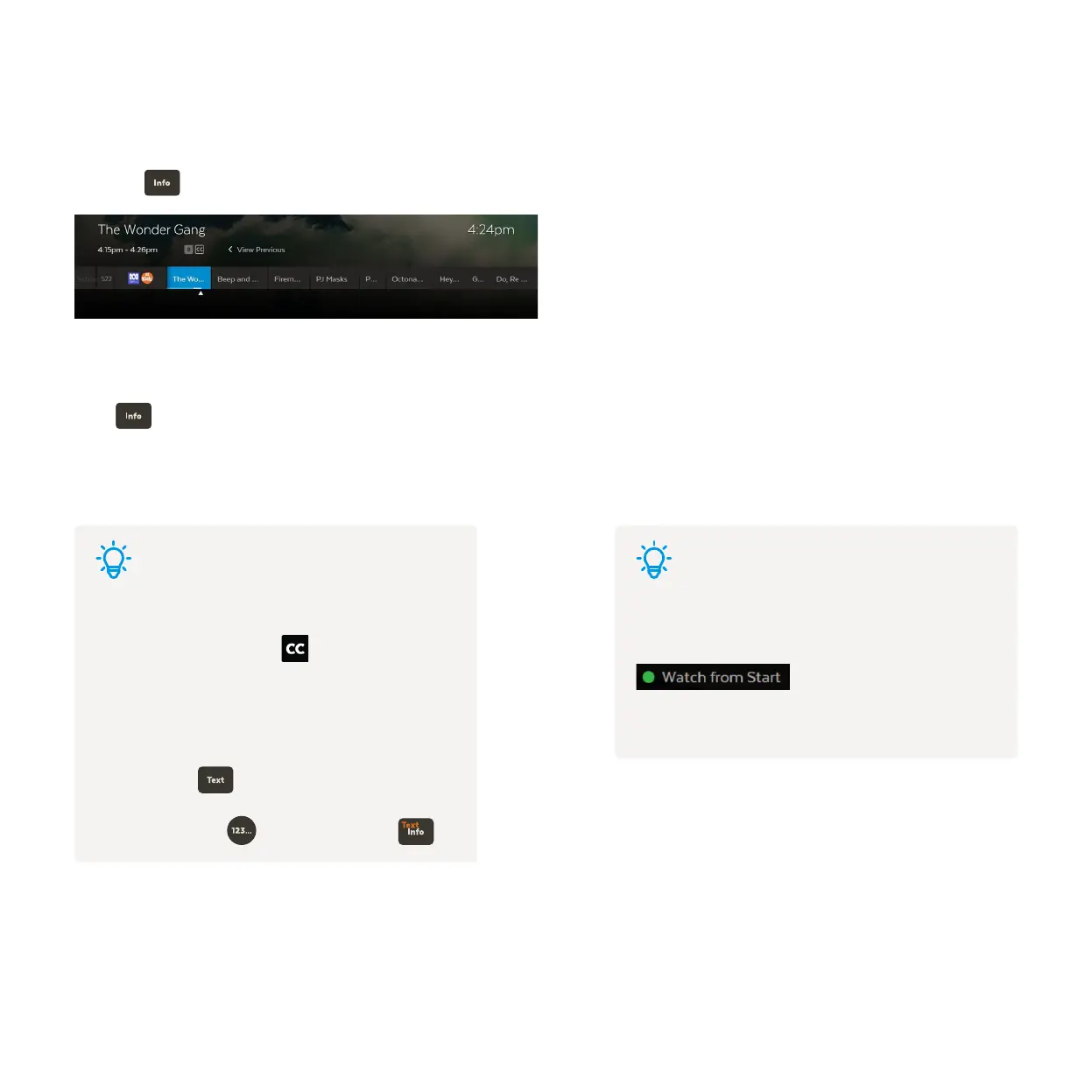 You can go forward in the Info Bar to see what’s coming up or back to catch up on shows you’ve missed.