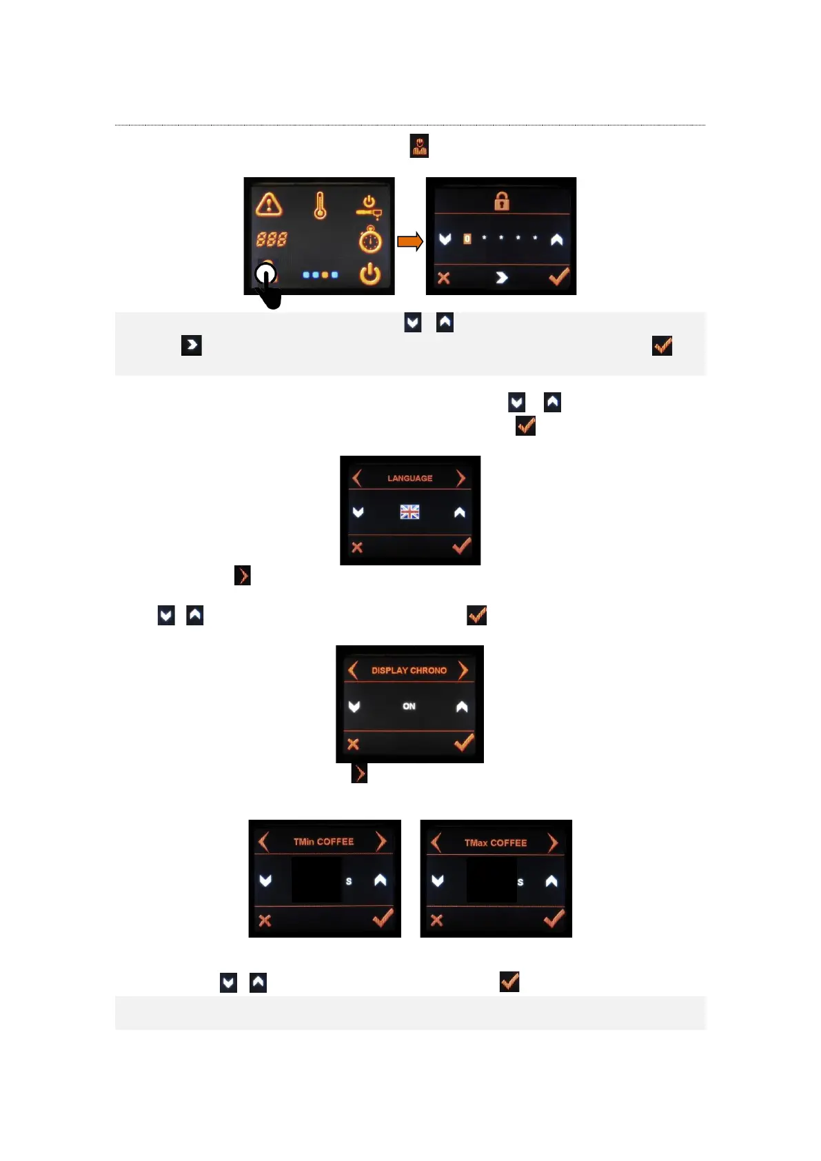 Seguir hacia los itens siguientes pulsando ; en el visor se pueden ver las opciones donde se definen