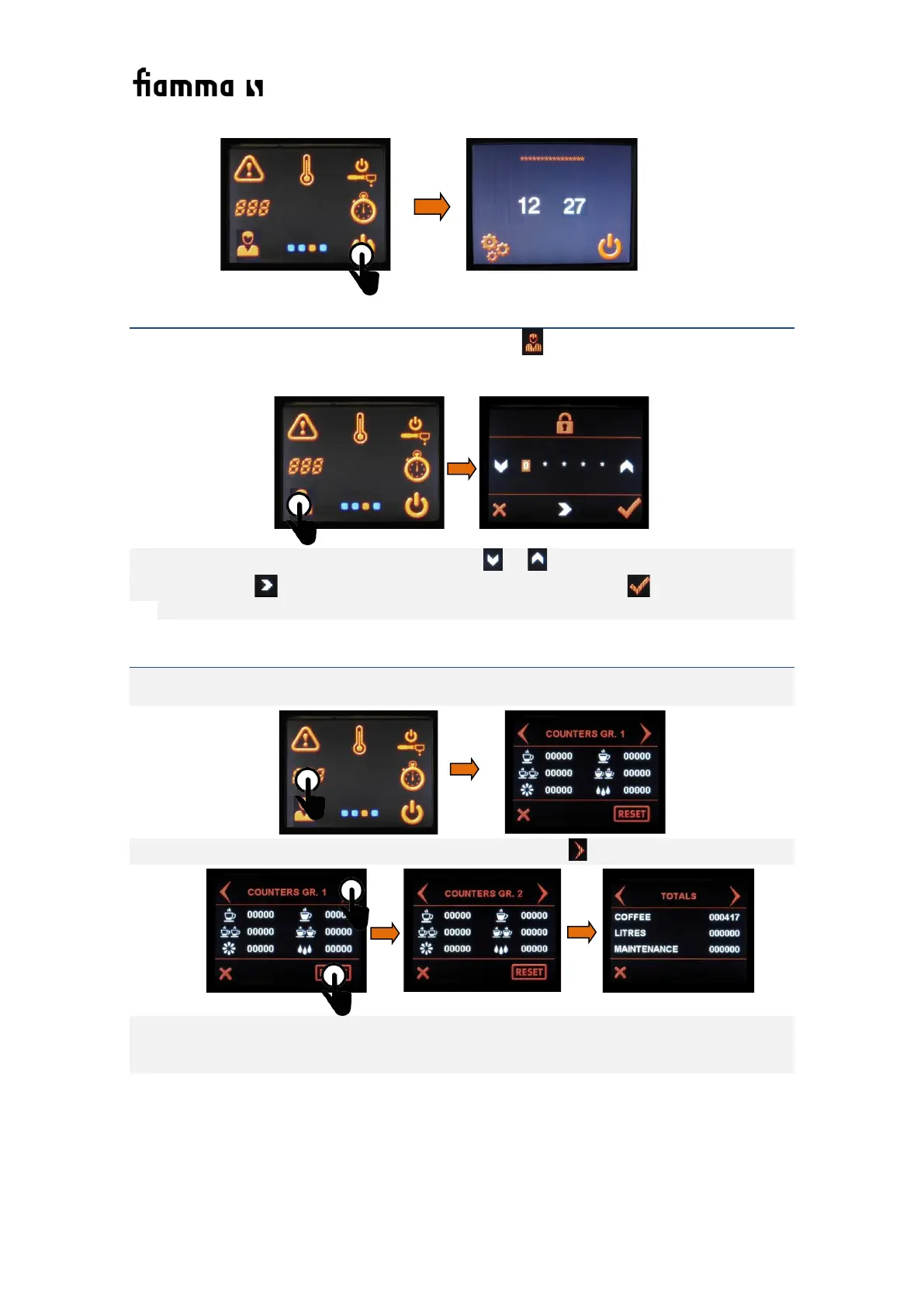 Symbol 14 gives access to the consumption counters, showing the quantities of coffee and water