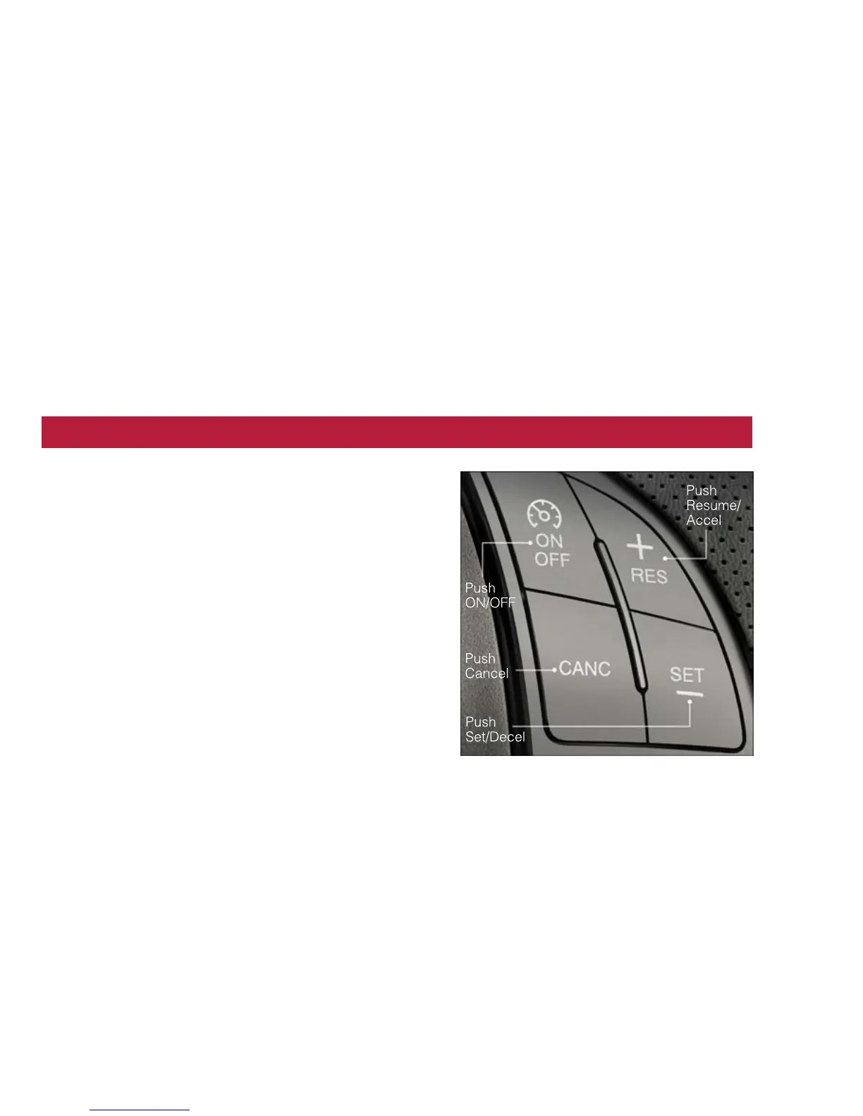 • Push and hold the RES + button to accelerate in 5 mph (8 km/h) increments or push