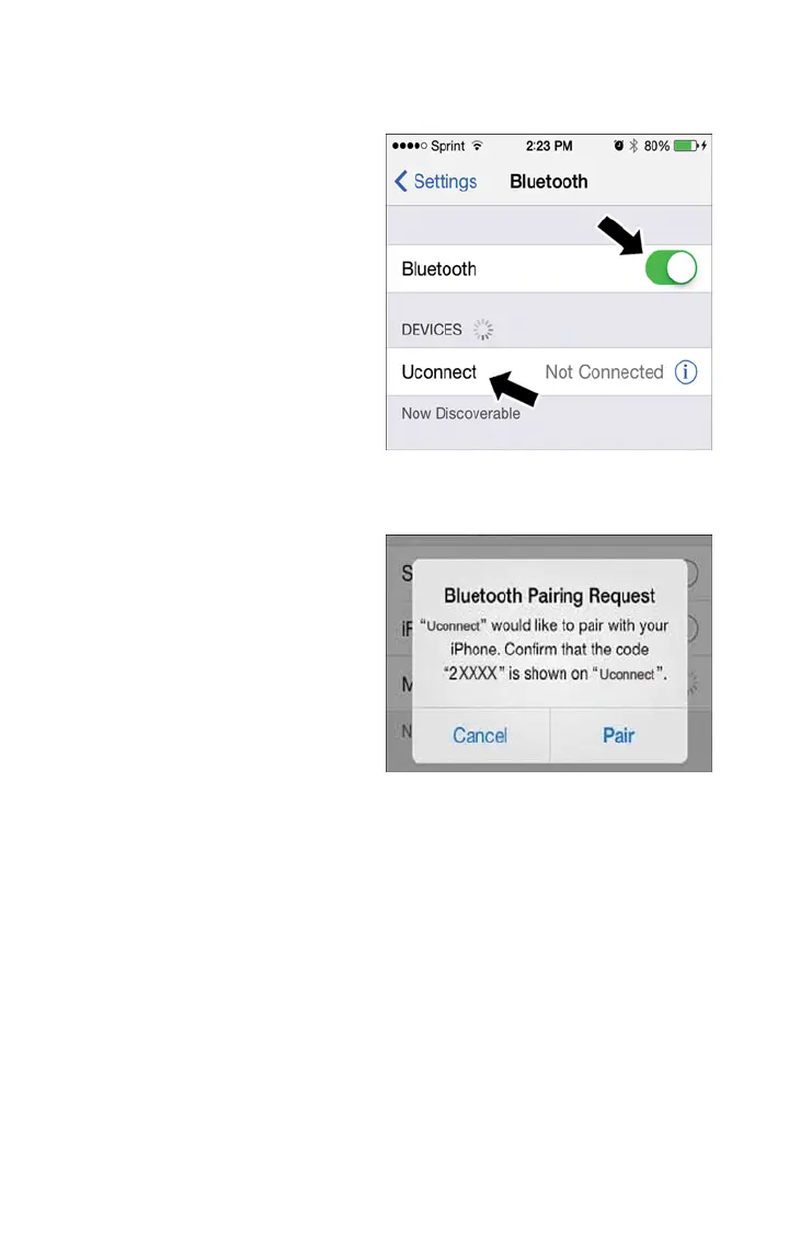 lect “Uconnect” from the mobile phone/audio device Bluetooth screen, and the Uconnect
