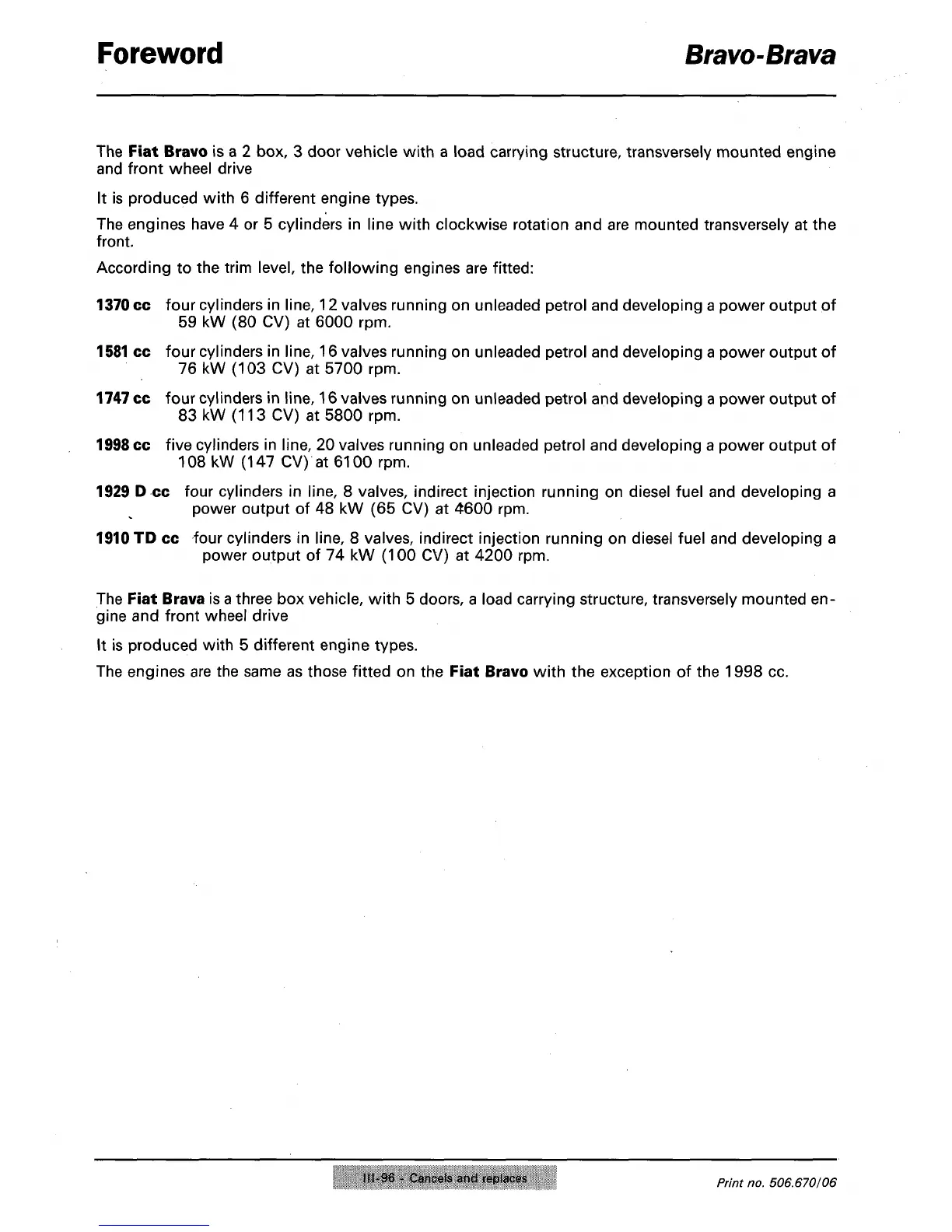 The engines are the same as those fitted on the Fiat Bravo with the exception of the 1998 cc.