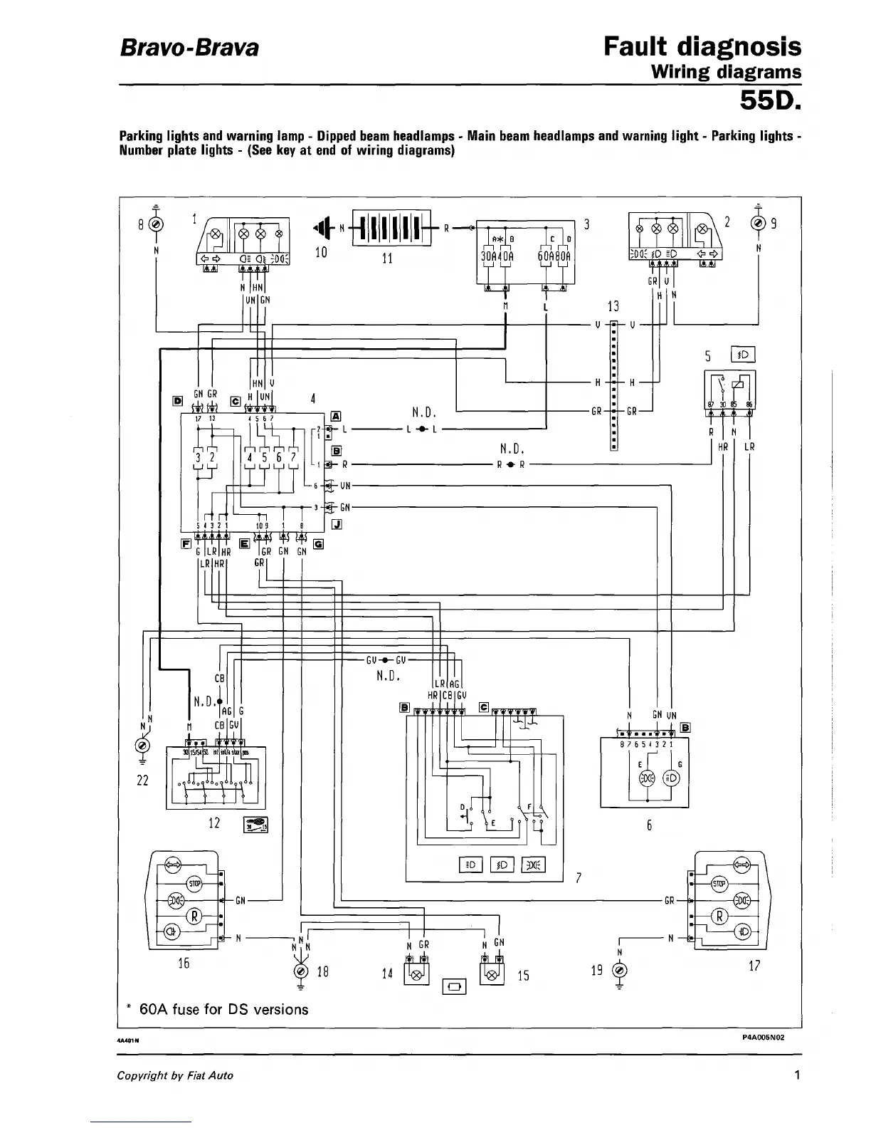 Fiat Brava - Fault Diagnosis; Wiring Diagrams; Parking Lights and Warning Lamp - Dipped Beam Headlamps - Main Beam Headlamps and Warning Light - Parking Lightsnumber Plate Lights