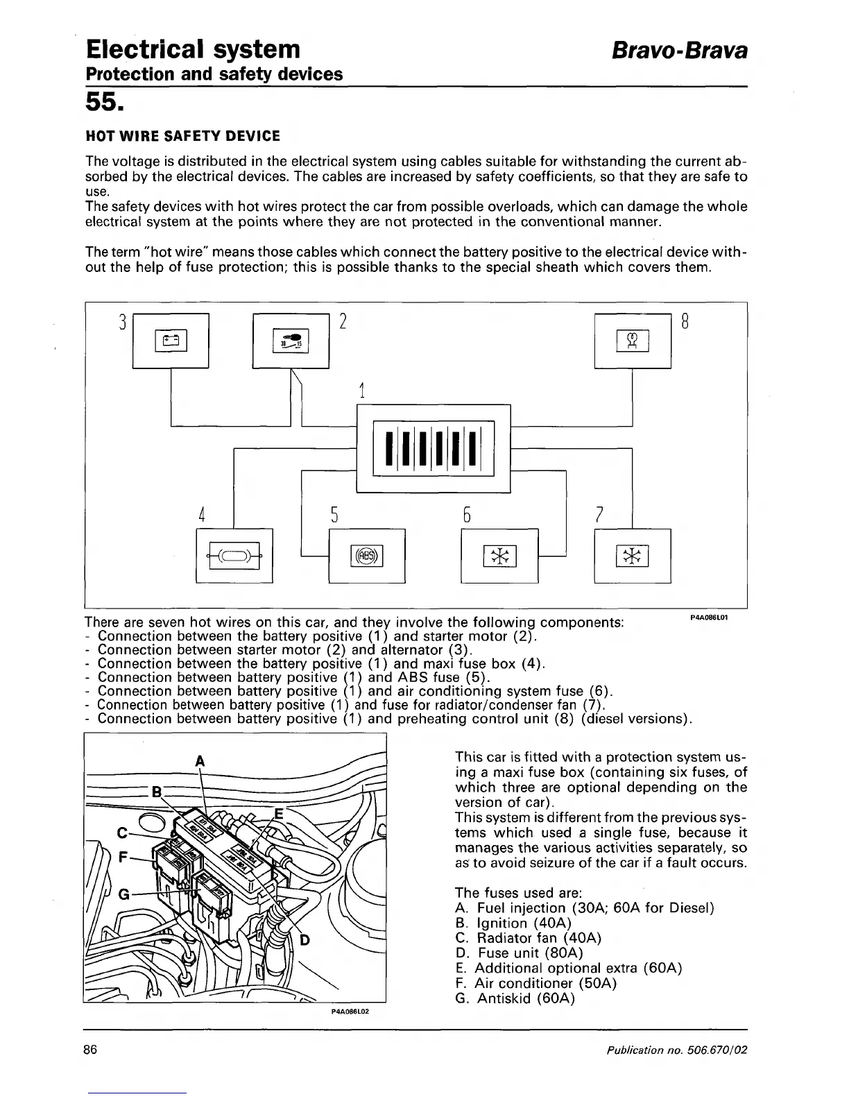 - Connection between battery positive (1) and fuse for radiator/condenser fan (7).