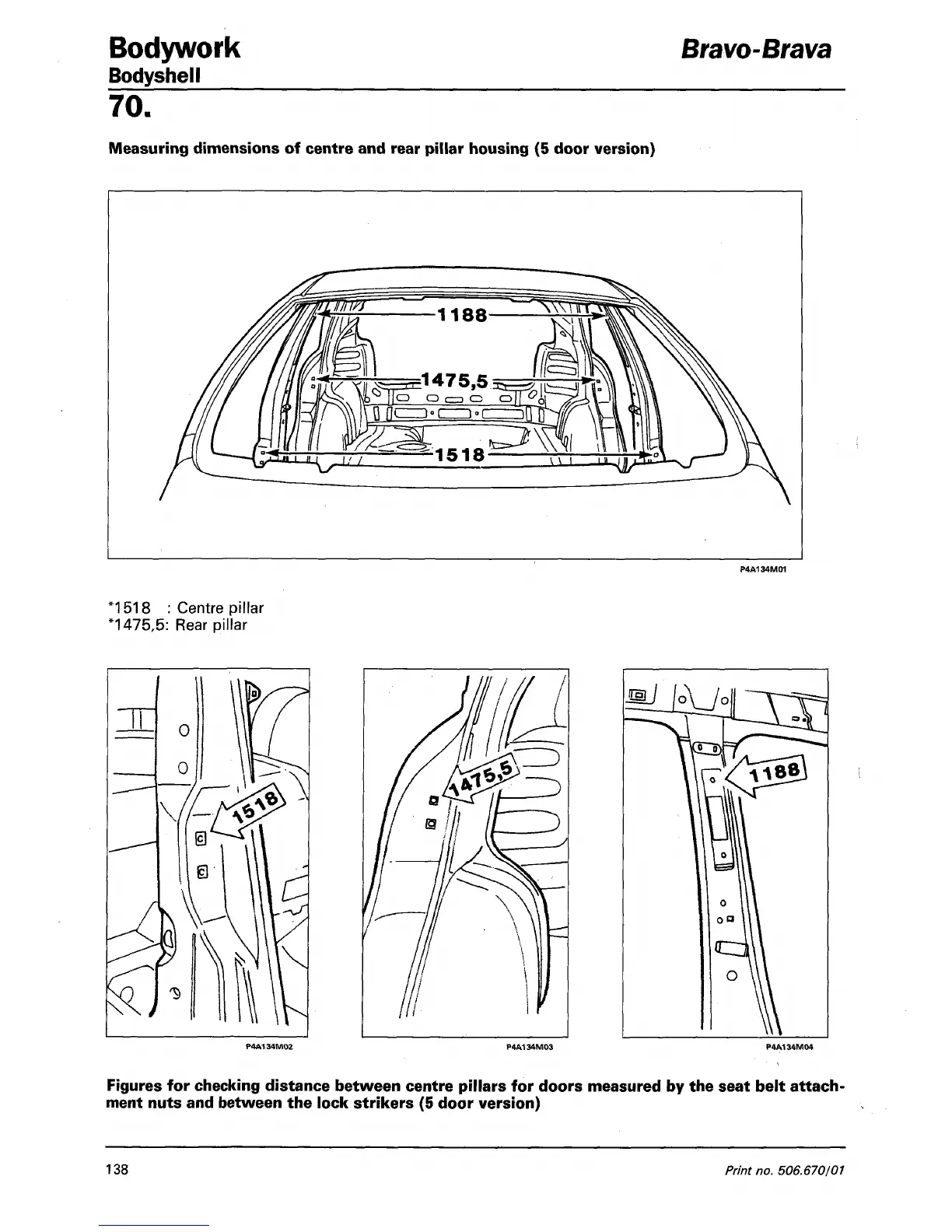 Fiat Brava - Measuring Dimensions of Centre and Rear Pillar Housing (5 Door Version)