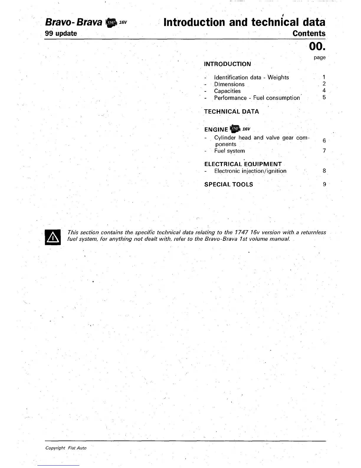 This section contains the specific technical data relating to the 7747 16v version with a return less