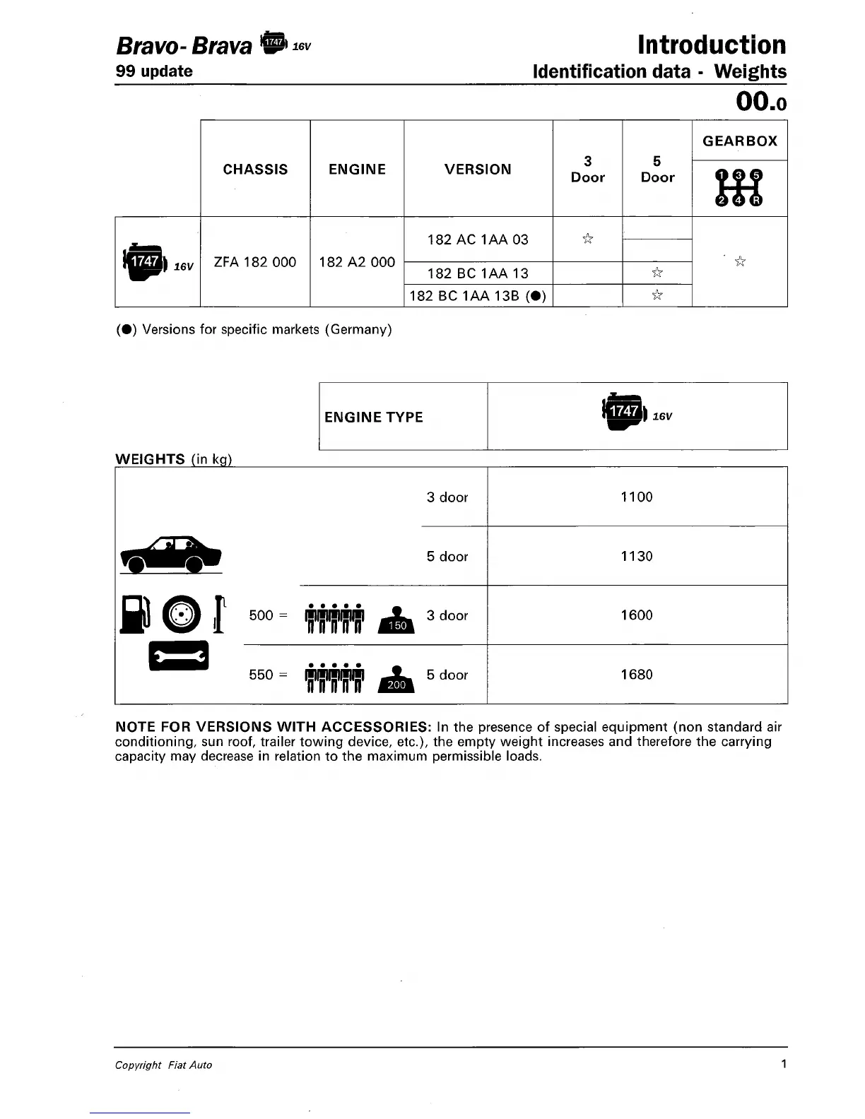 Fiat Bravo/Brava - Identification Data - Weights; Bravo-Brava; Update; Introduction