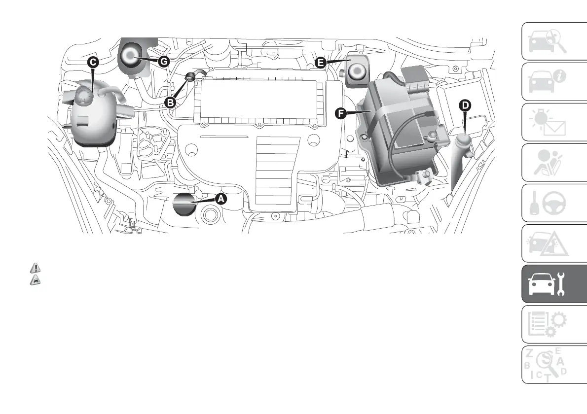 A. Engine oil filler B. Engine oil dipstick C. Engine coolant fluid D. Windscreen washer fluid E. Brake fluid F. Battery G. Power steering fluid