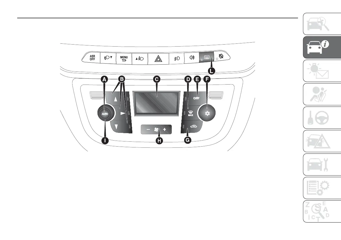 A AUTO button for automatic control of all functions. - B Air distribution selection button. - C Display. - D MAX DEF function