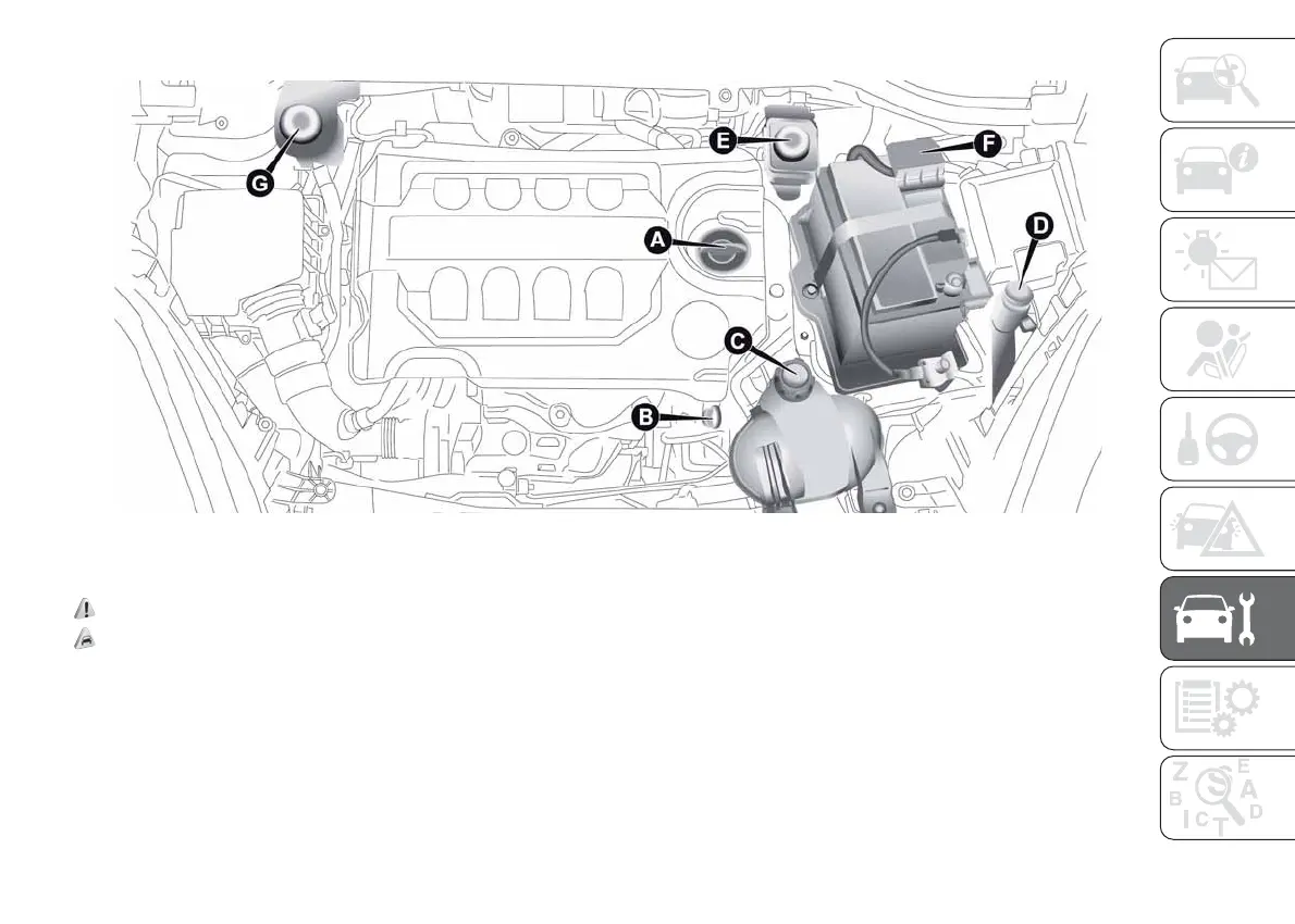 A. Engine oil filler B. Engine oil dipstick C. Engine coolant D. Windscreen washer fluid E. Brake fluid F. Battery G. Power steering fluid