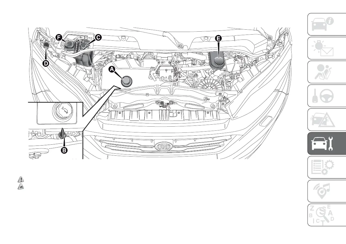 A. Engine oil filler plug B. Engine oil dipstick C. Engine coolant fluid D. Windscreen washer fluid E. Brake fluid F. Power steering fluid