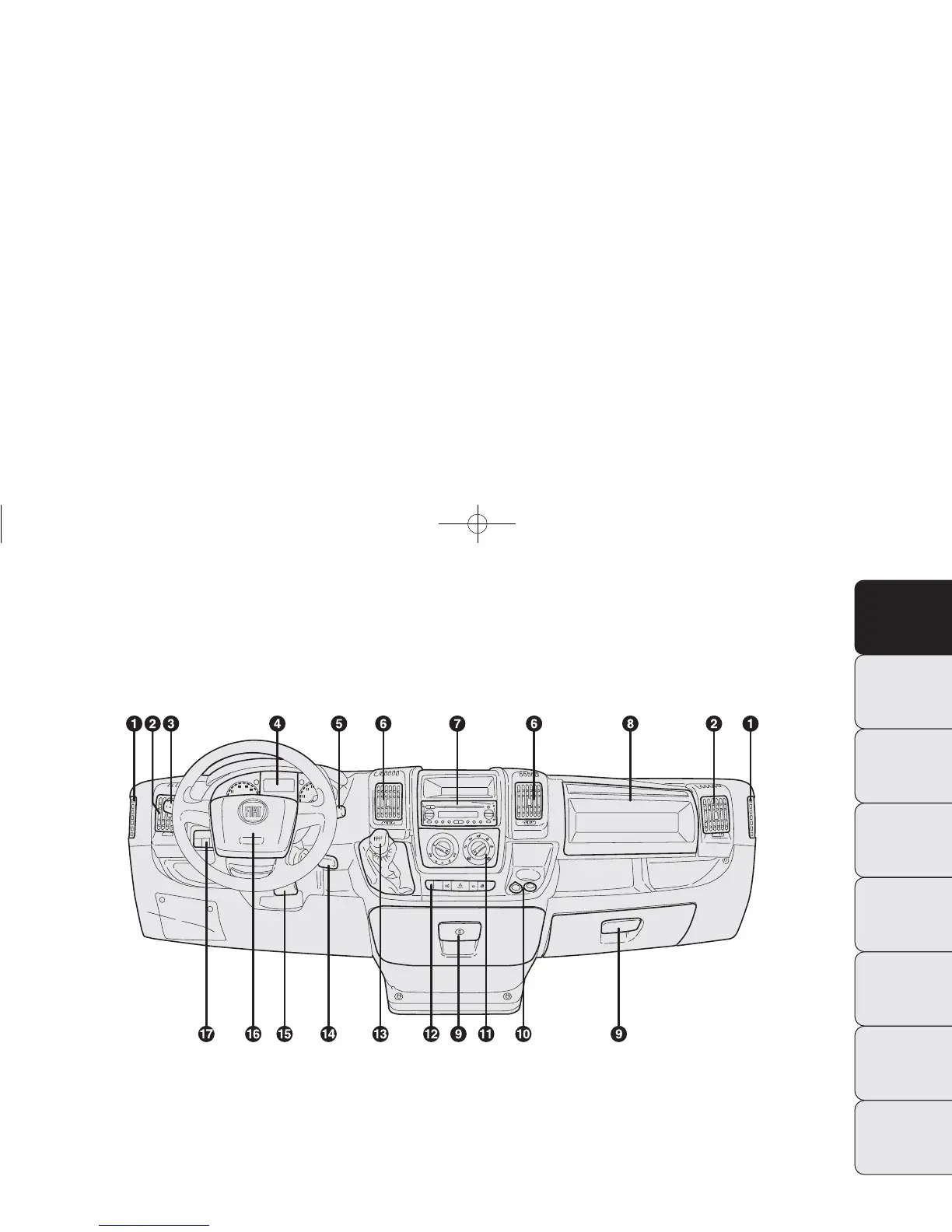1. Fixed side air – vents – 2. Adjustable side air vents – 3. Left steering column stalk: external lights – 4. Instrument and