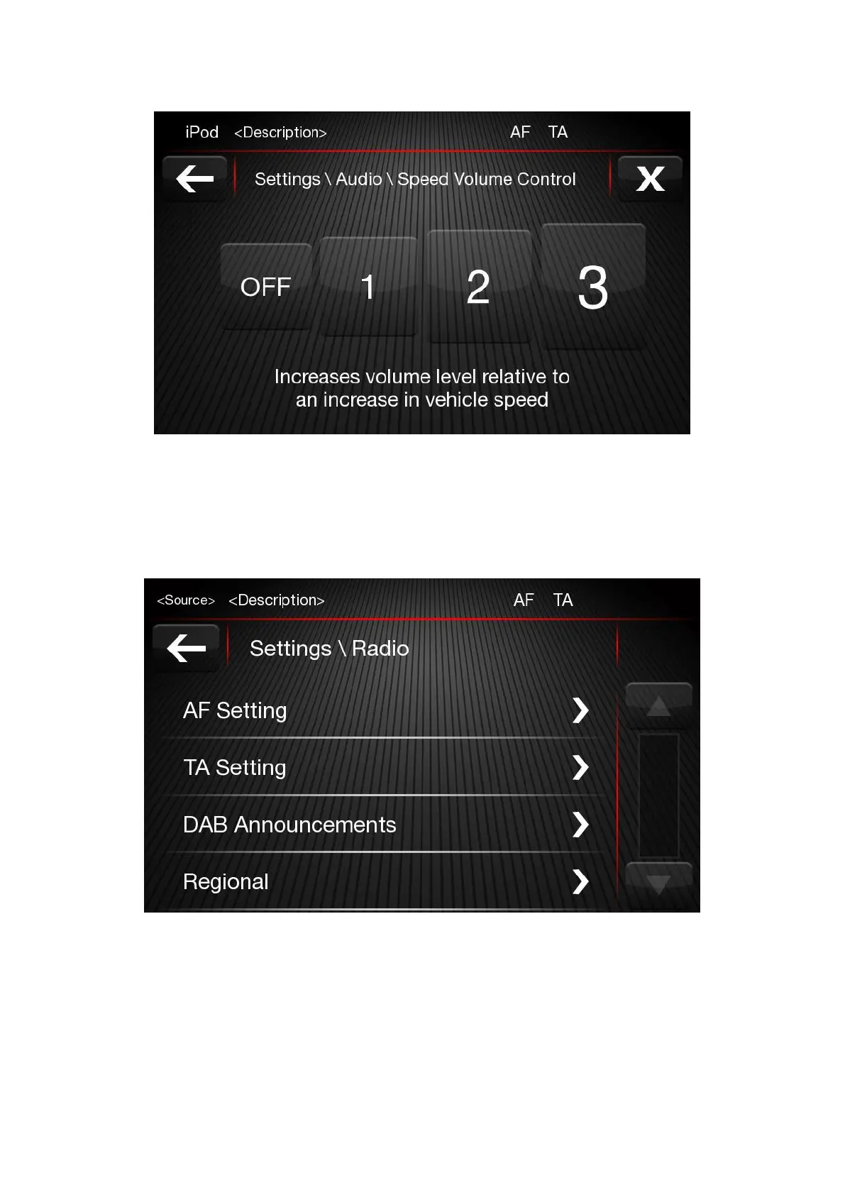 Alternative Frequency and Traffic Announcement functions can be activate/deactivate under Radio