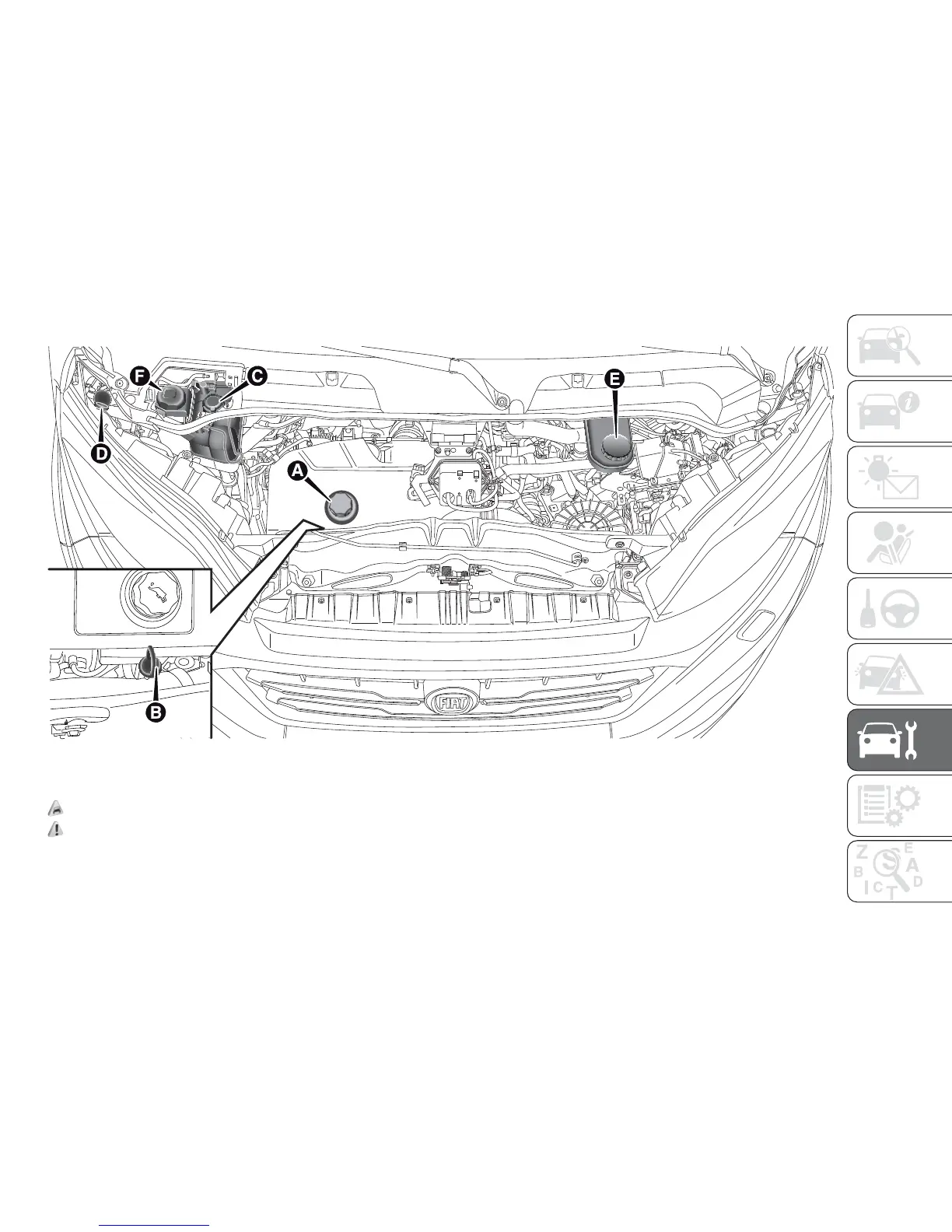A. Engine oil filler plug B. Engine oil dipstick C. Engine coolant D. Screen washer fluid E. Brake fluid F. Power steering fluid