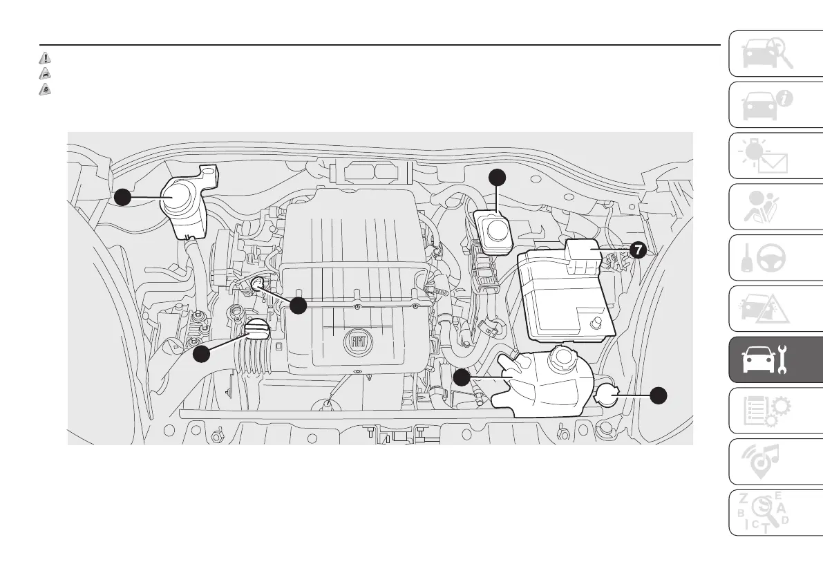 1. Engine oil level dipstick 2. Engine oil cap/filler 3. Engine coolant 4. Windscreen/rear window washer fluid 5. Brake fluid 6.