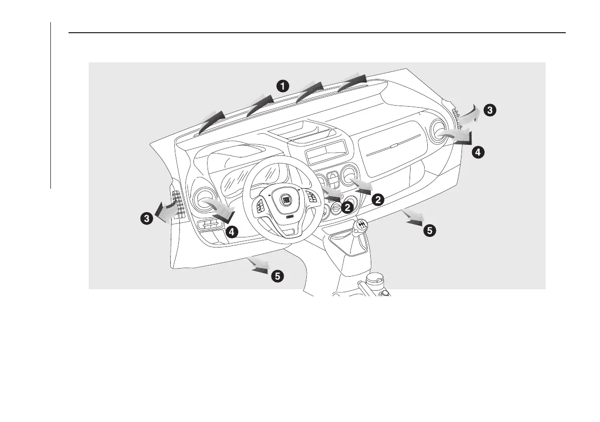1. Upper fixed vent 2. Adjustable central vents 3. Fixed side vents 4. Adjustable side vents 5. Foot well vents
