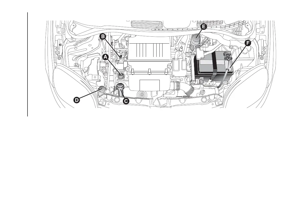 A. Engine oil plug/filler-–B.Engine oil dipstick-–C.Engine coolant-–D.Washer fluid for windscreen/rear window-–E.Brake fluid-–F.Battery