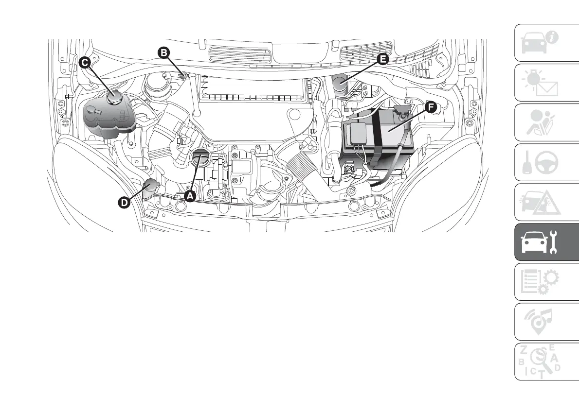 A. Engine oil plug/filler-–B.Engine oil dipstick-–C.Engine coolant-–D.Washer fluid for windscreen/rear window-–E.Brake fluid-–F.Battery