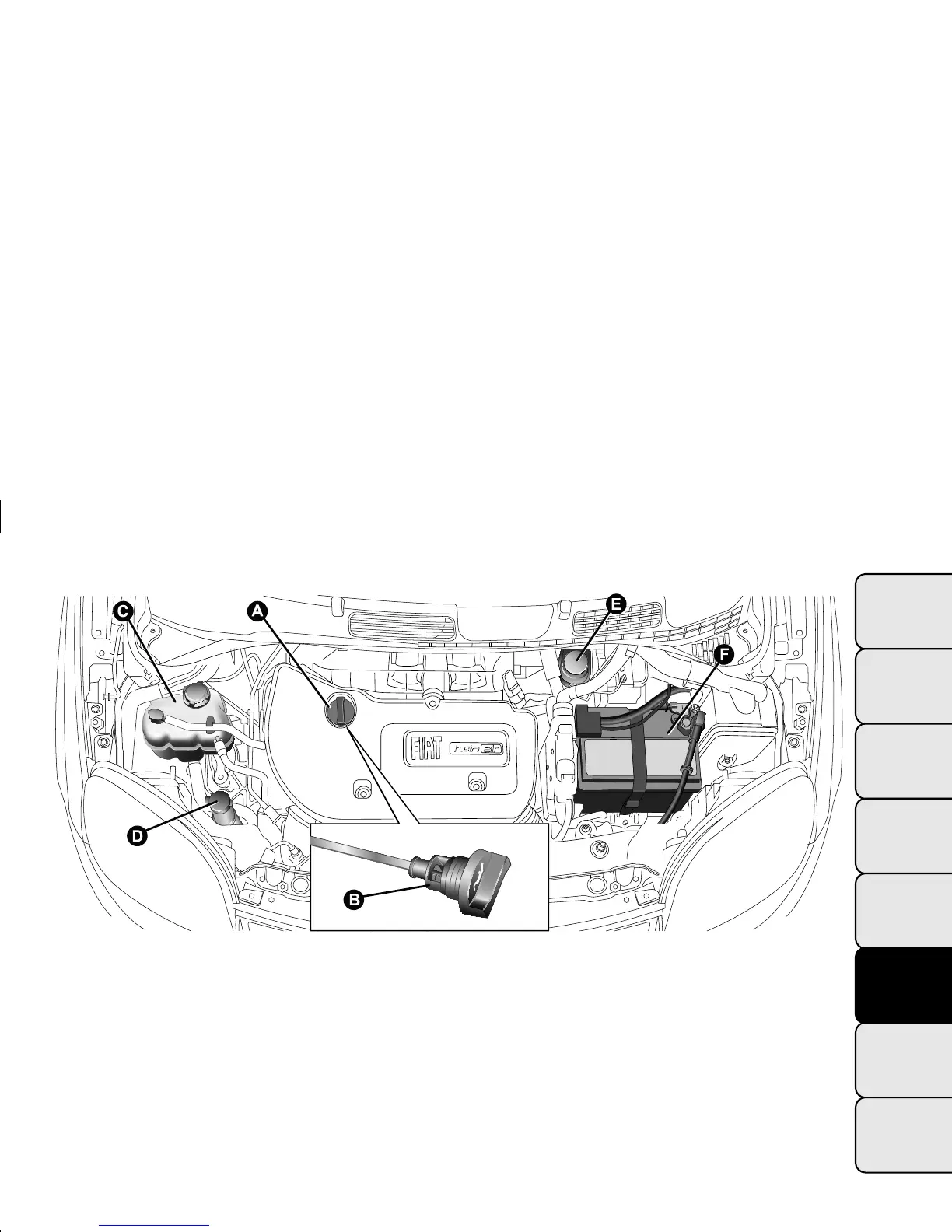 A. Engine oil plug/filler - B. Engine oil dipstick - C. Engine coolant - D. Washer fluid for windscreen/rear window - E. Brake