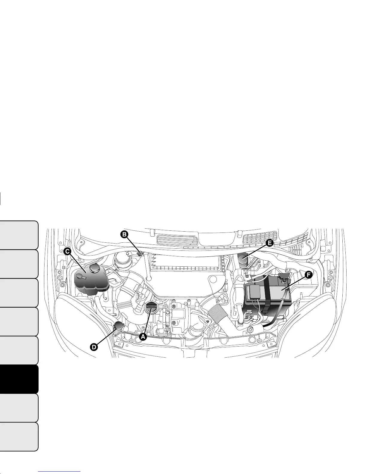 A. Engine oil plug/filler - B. Engine oil dipstick - C. Engine coolant - D. Washer fluid for windscreen/rear window - E. Brake
