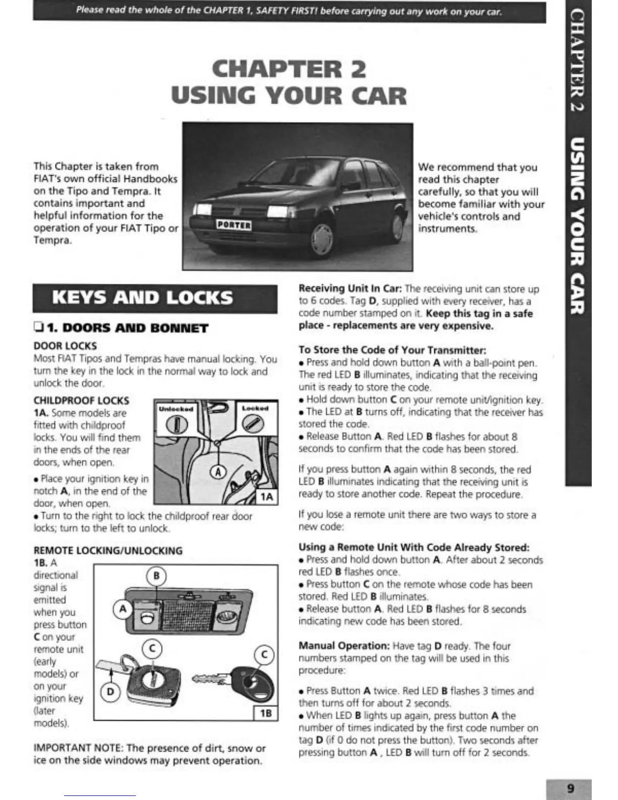 Fiat Tempra 1990 - Using Your Car; Keys and Locks; Doors and Bonnet; Door Locks