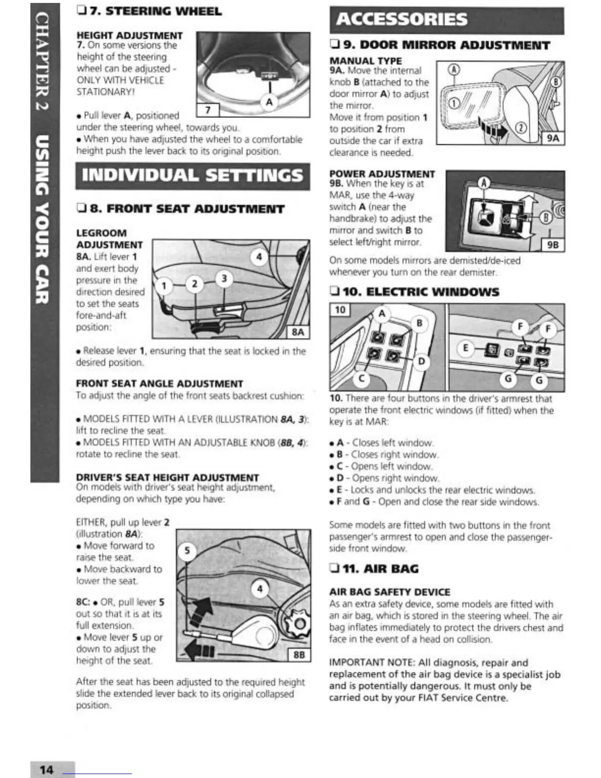 Fiat Tempra 1995 - Steering Wheel and Seat Adjustments