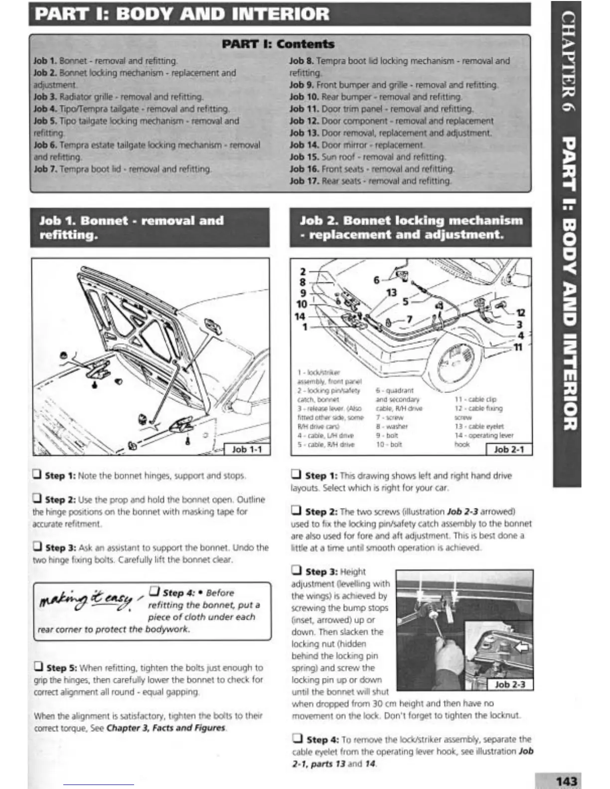 Fiat Tipo 1995 - Body and Interior; Bonnet Removal and Refitting; Bonnet Locking Mechanism Replacement and Adjustment
