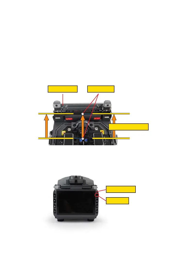 ② Raise left and right ber clamps on the splicer. Hold the heat-shrink tube, lift the