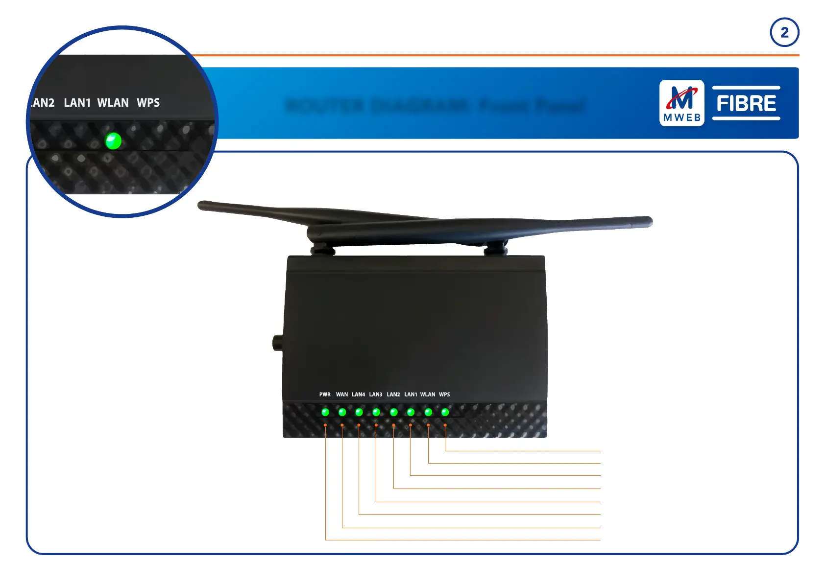 Fibre WR7010v2 - Router Front Panel Diagram; Front Panel Indicators and Ports