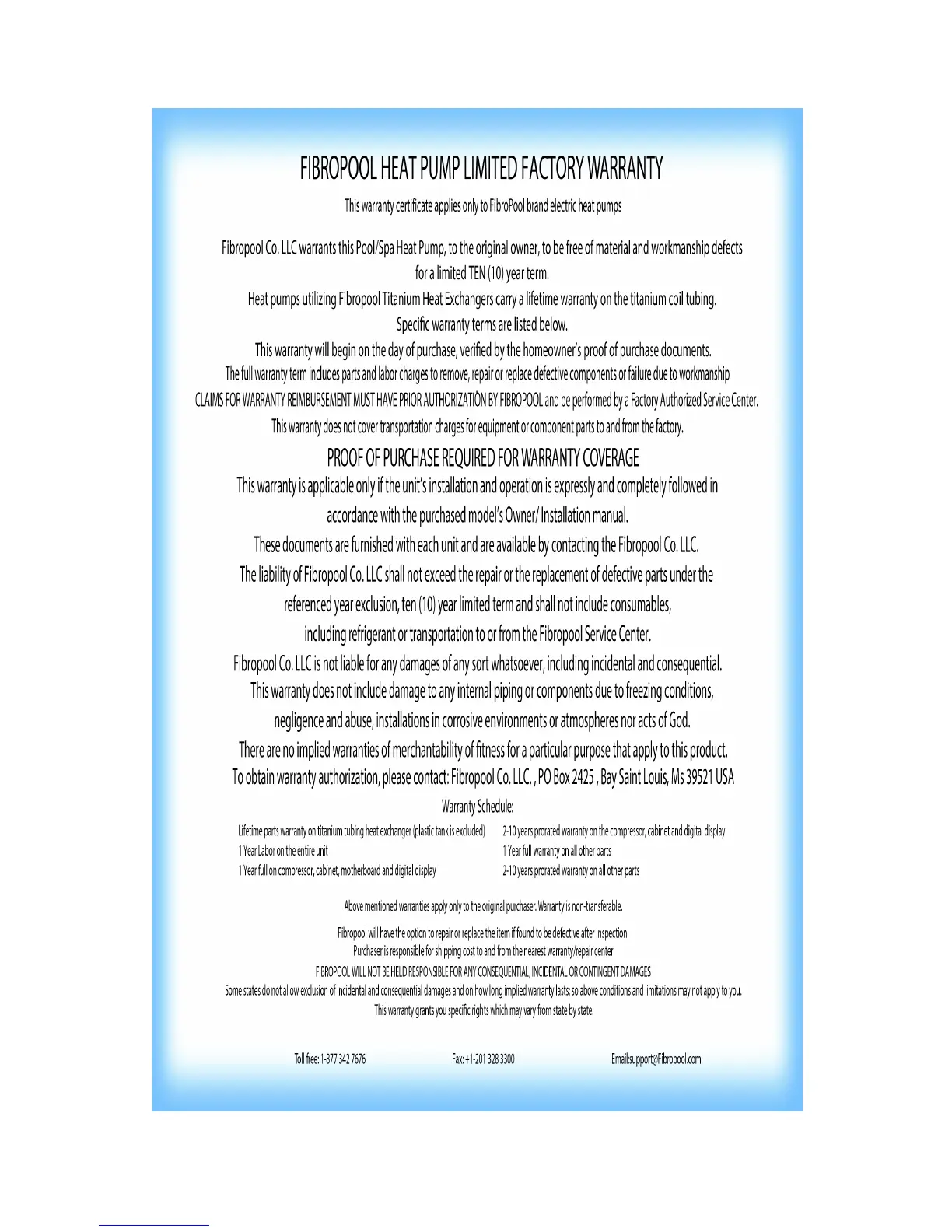 FibroPool FH-020 - FIBROPOOL HEAT PUMP LIMITED FACTORY WARRANTY