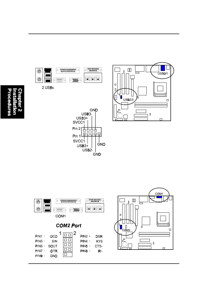 COM1 (9-pin D-sub male connector with teal color) and COM2 (9-pin male