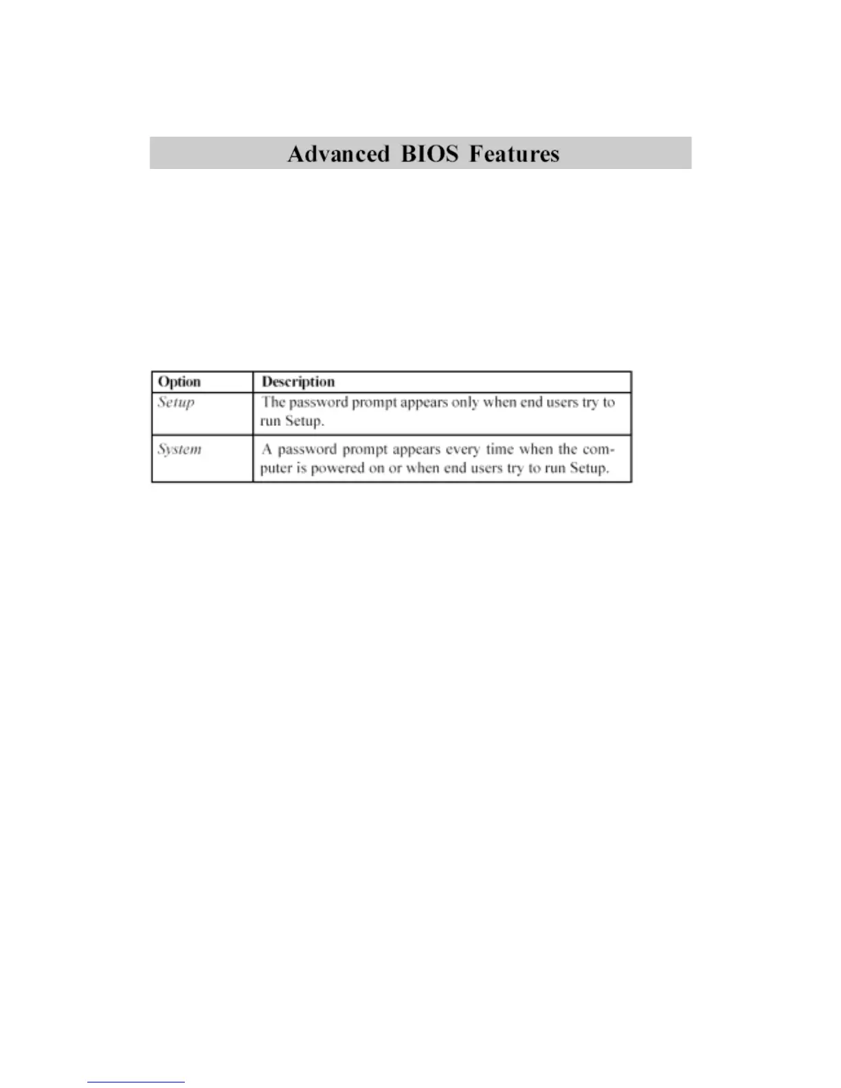 Specifies the type of BIOS password protection that is implemented. Settings
