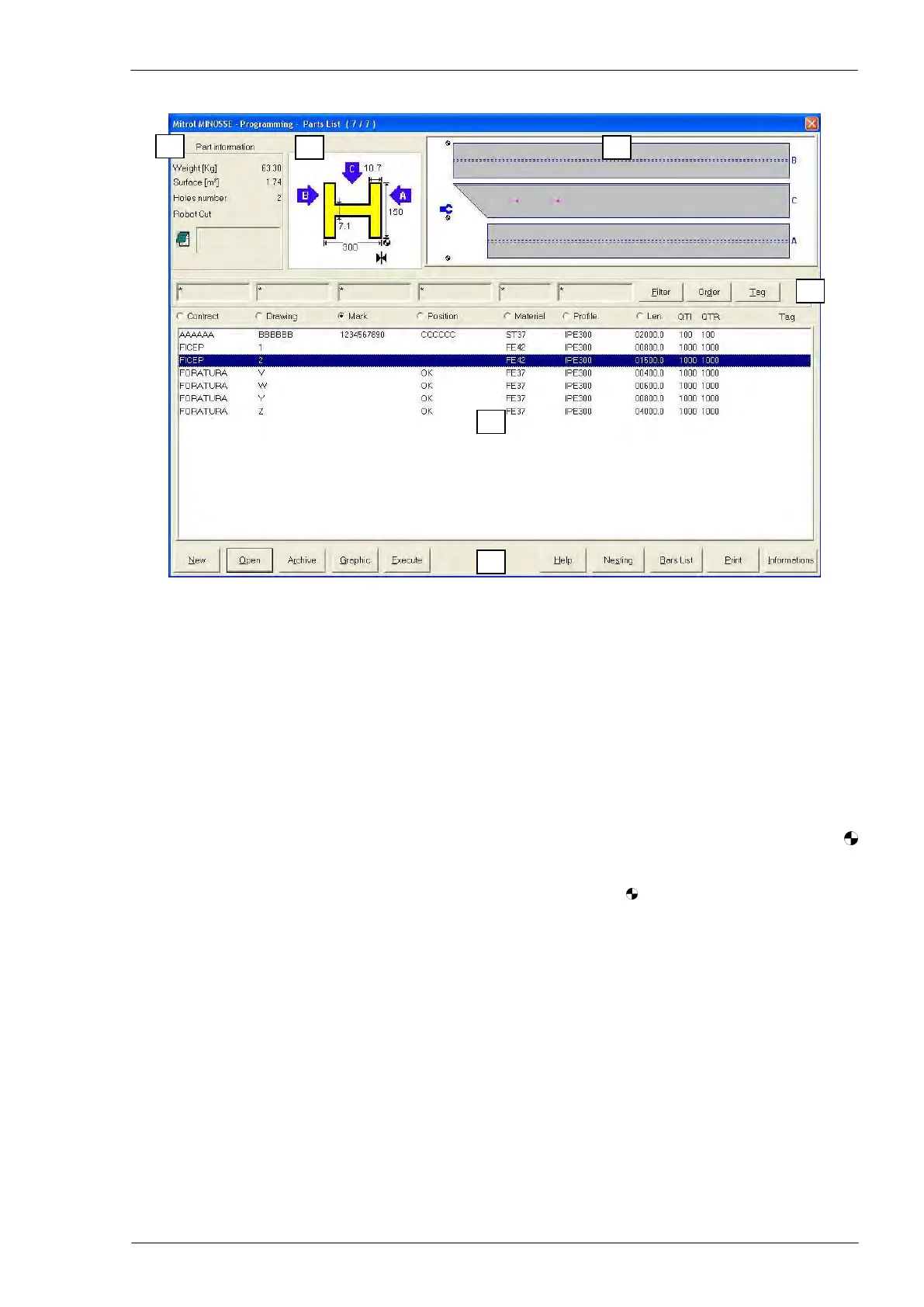 “Graphic”: to display a window with a scaled graphic view of the part selected in the zone n. 5