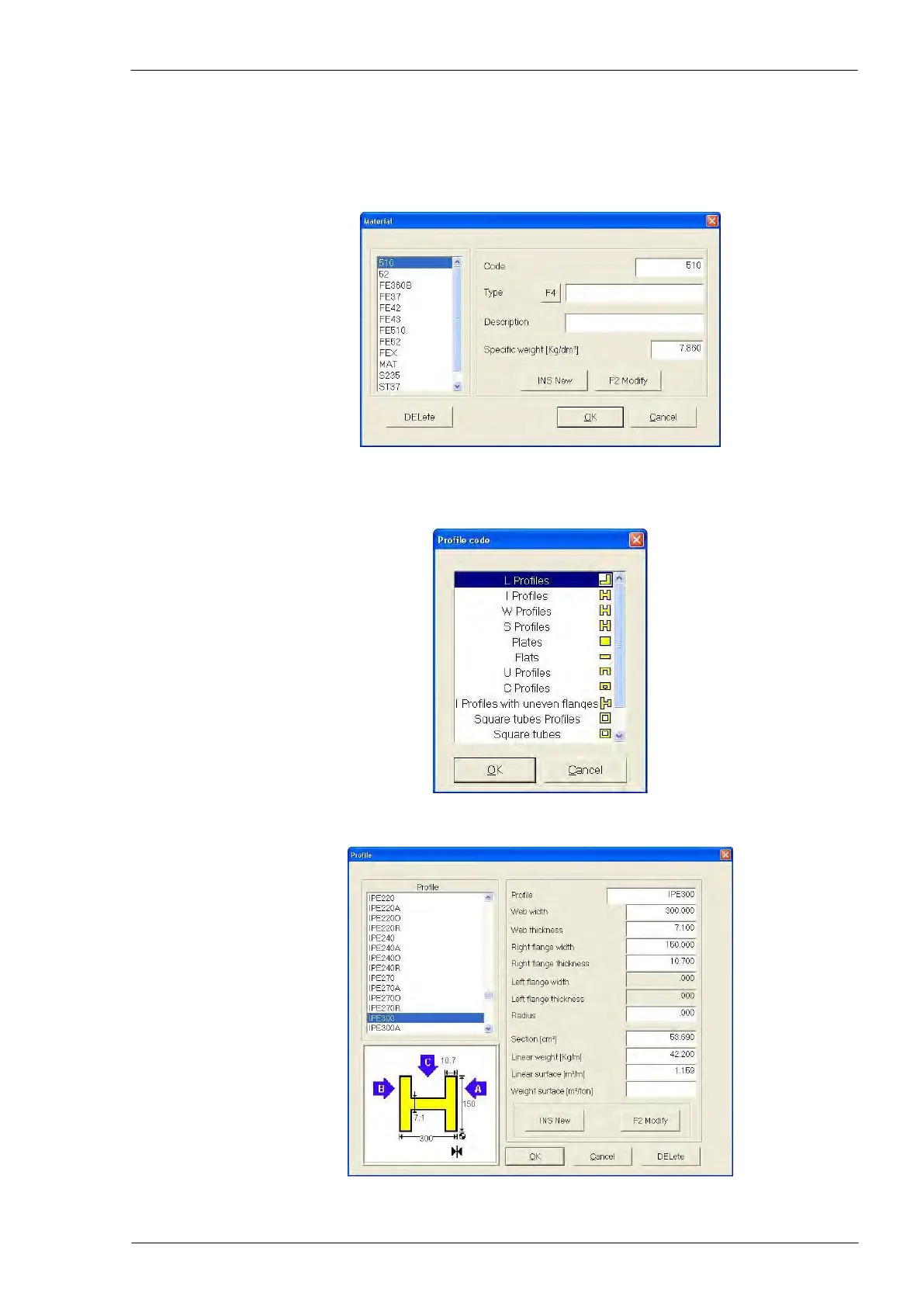Dimensions of profile: to select standard dimensions (or to insert/modify dimensions),
