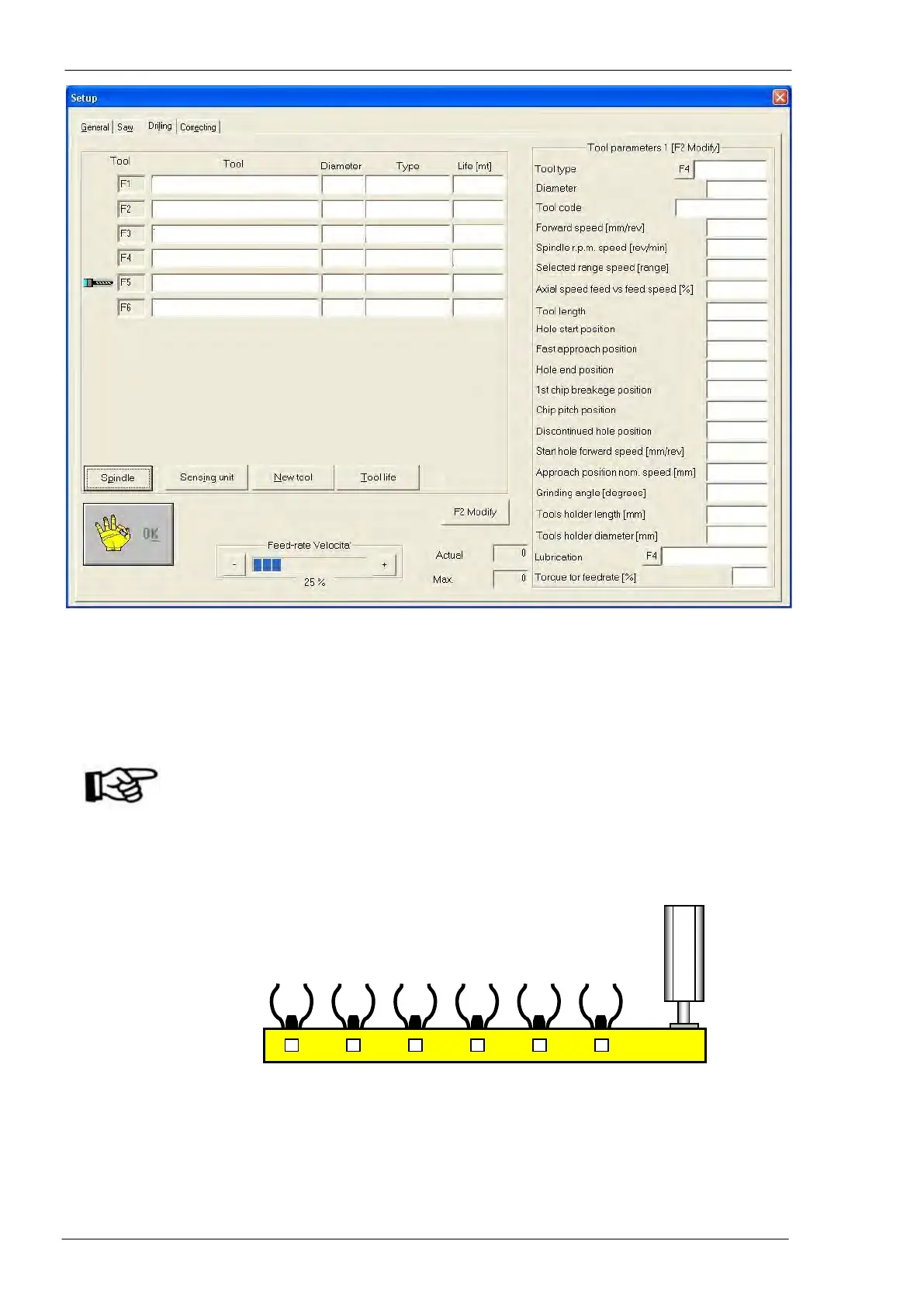 Each line corresponds to the tool placed in the relative forked site of tools magazine (F1