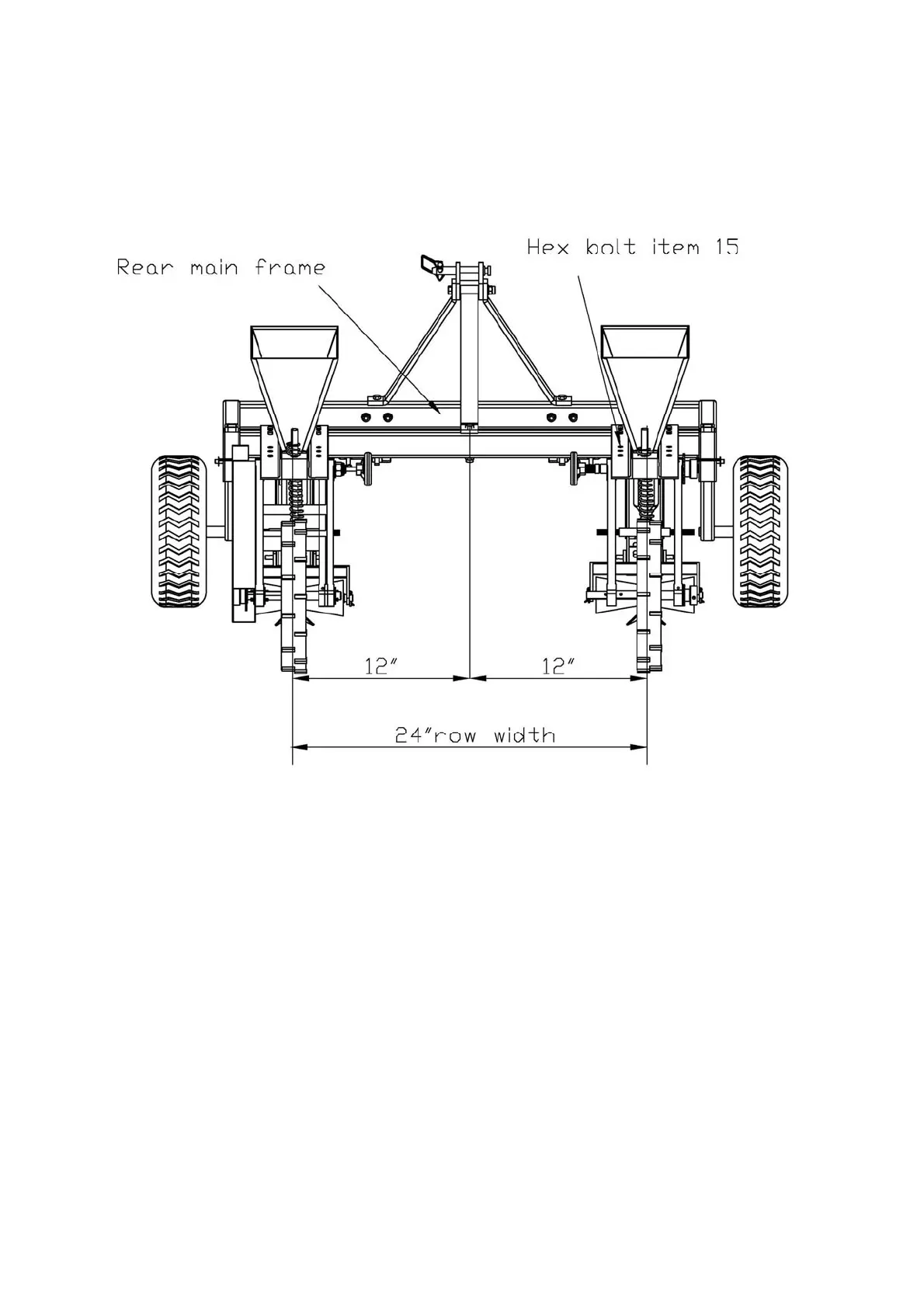 1.To adjust the row width loosen the 4 hex bolts item 15, that fasten the planter