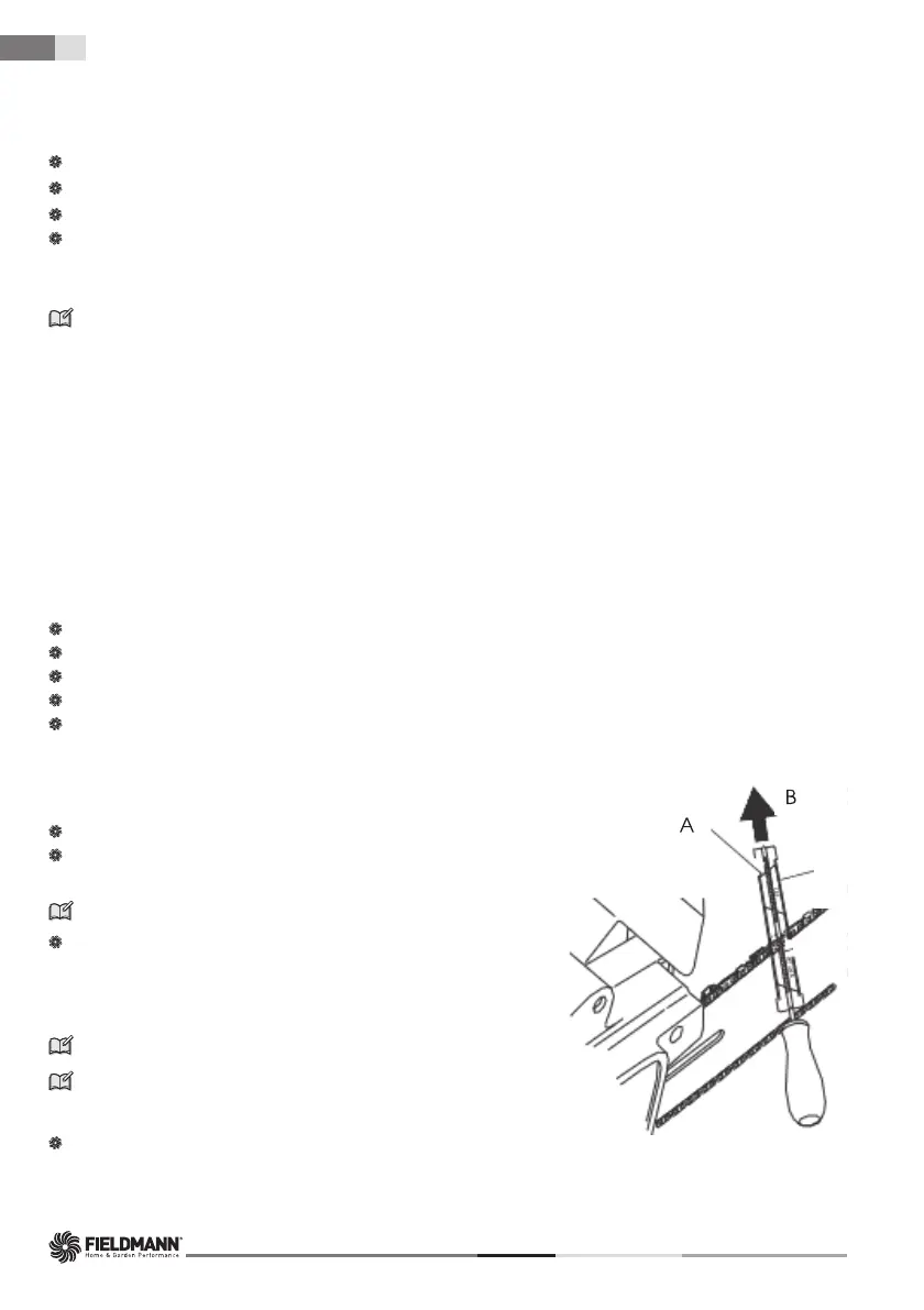 Regularly remove sawdust from the guide bar groove. For cleaning use a spatula or a wire.