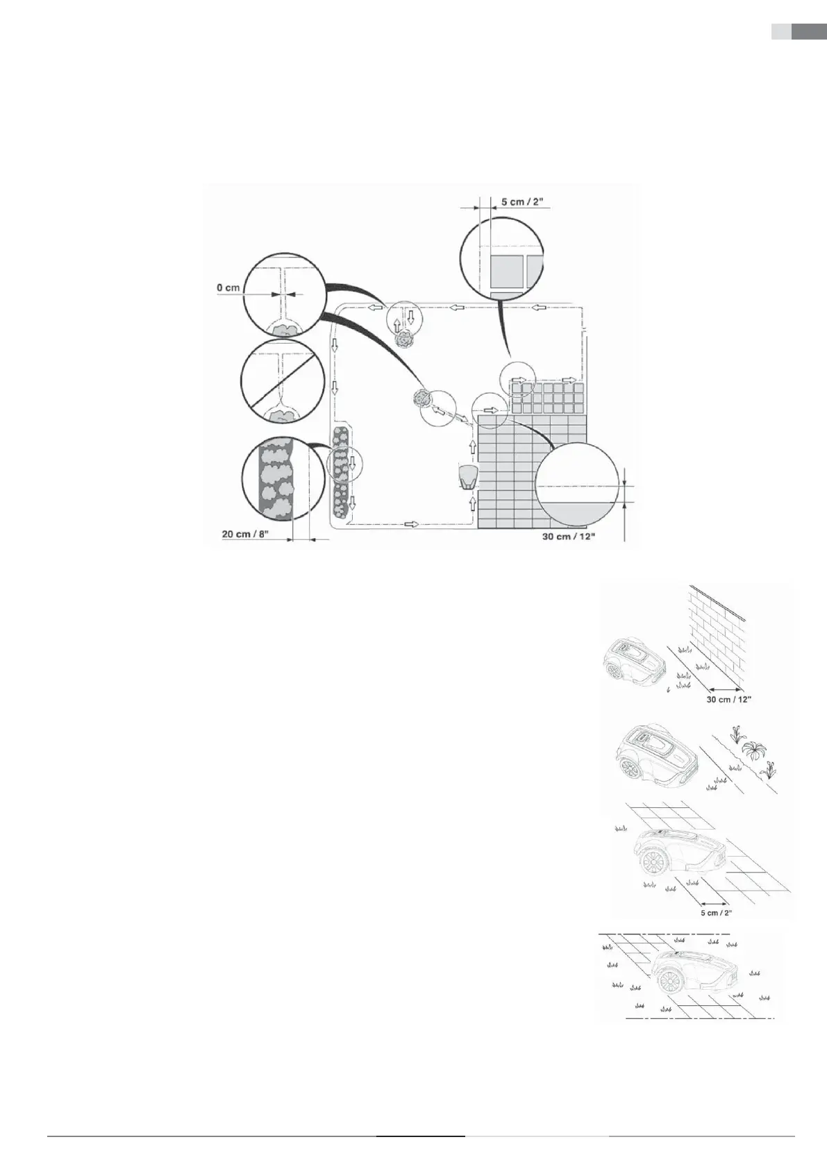 Depending on what the working area is adjacent to, the perimeter wire must be laid at different distances from obstacles. The fi gure below shows how the perimeter