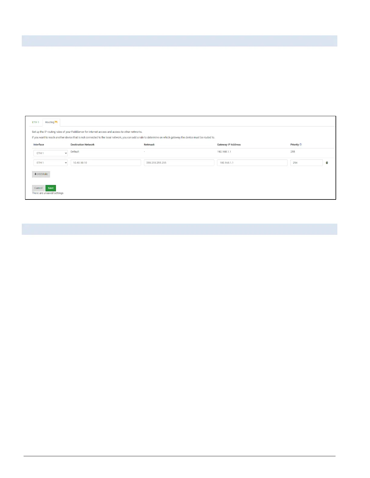 The Routing settings make it possible to set up the IP routing rules for the FieldServer’s internet and