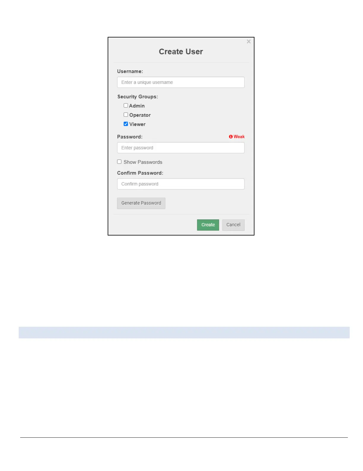 • Enter the new User fields: Name, Security Group and Password.