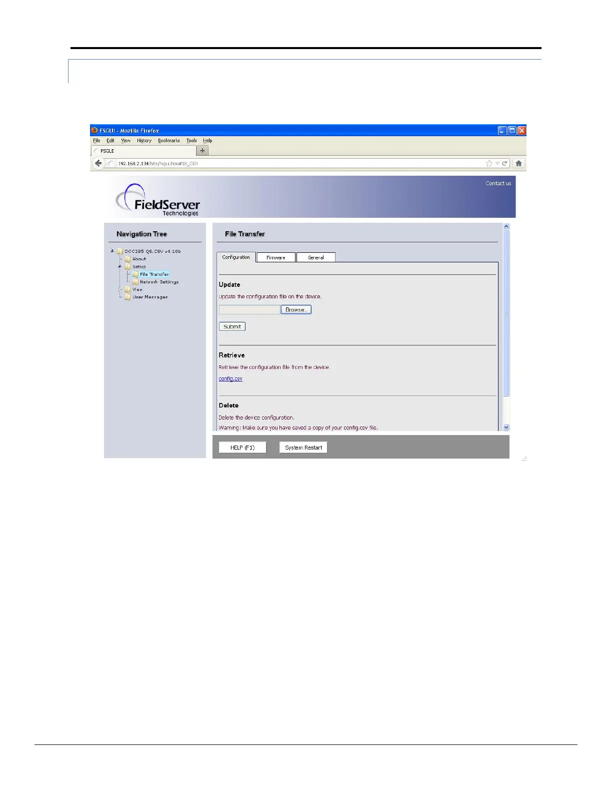 In the main menu of the FS-GUI screen, go to Setup, File Transfer, Update