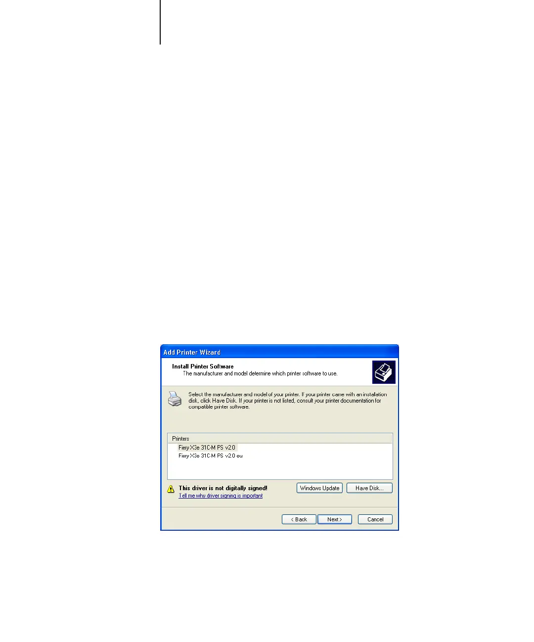 8. In the Printers box, select the Fiery X3e printer driver appropriate for your printer and