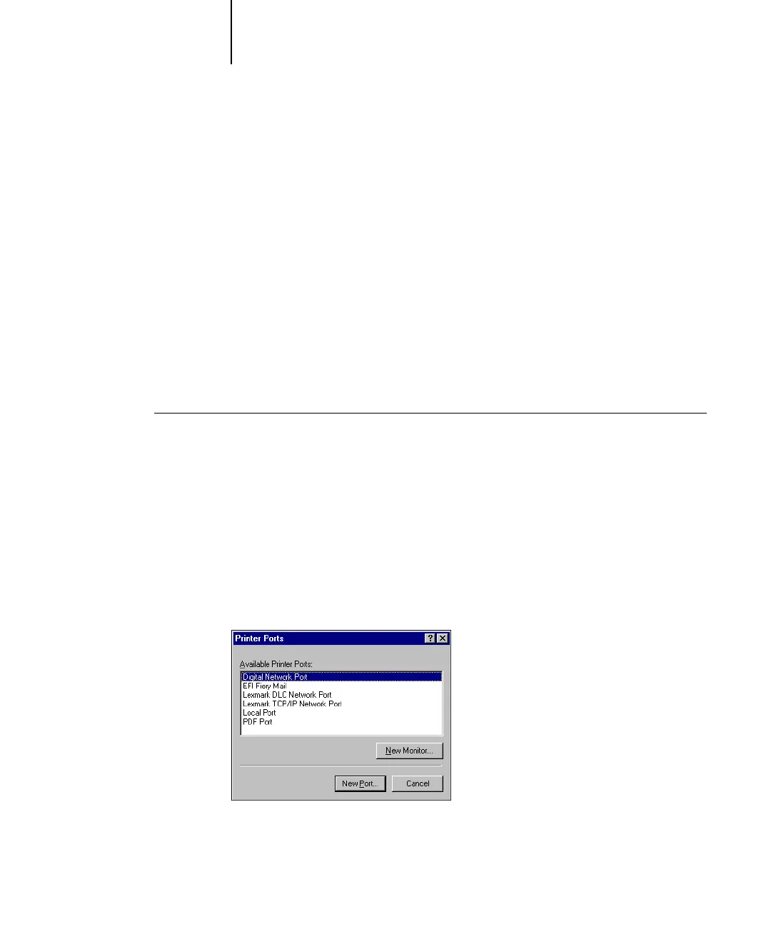 The Printer Ports dialog box is displayed, with the EFI Fiery Mail port listed as one of