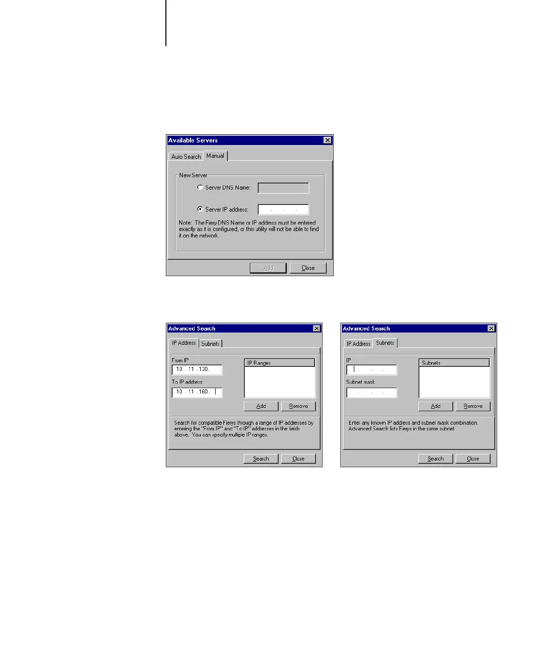 3. If no Fiery X3e servers were found, click the Manual tab to search by DNS name