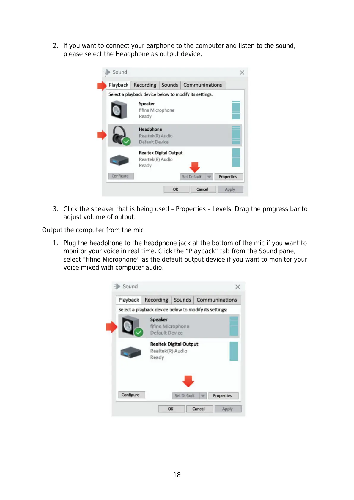 select “fifine Microphone” as the default output device if you want to monitor your