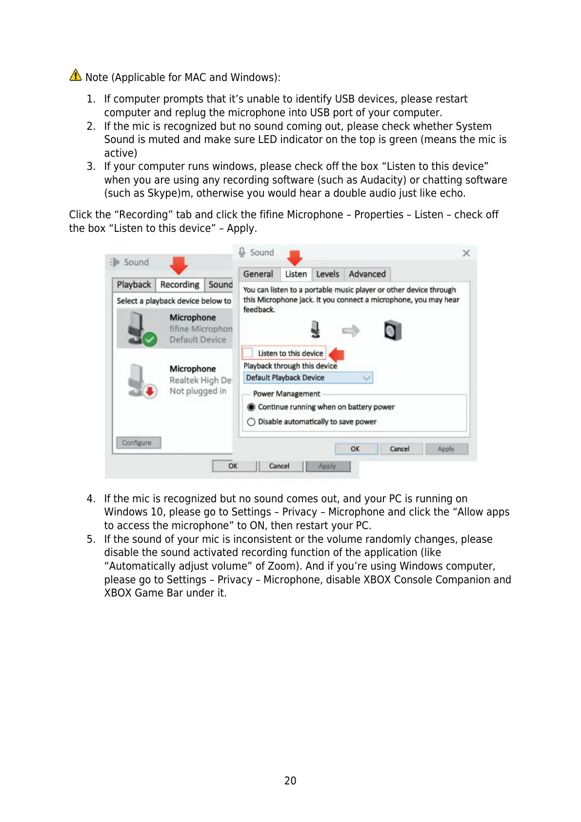 3. If your computer runs windows, please check off the box “Listen to this device”